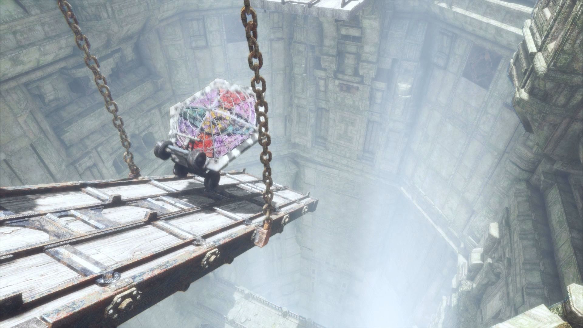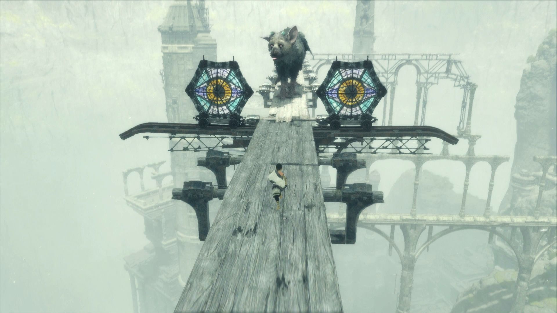 Tras una secuencia subimos las escaleras y salimos al exterior, y subidos sobre Trico intentamos que salte hacia la estructura que vemos enfrente. Tras un segundo salto, tendremos que dirigirnos hacia la zona de la derecha, avanzando por la parte superior sobre Trico. Luego daremos un salto hacia la parte inferior, y desde aquí un salto hacia el tejado de madera que vemos enfrente, siempre subidos sobre Trico. Ahora nos movemos hacia la derecha, y tras girar la esquina este tiene que dar un par de saltos hacia arriba, hasta llegar a una apertura en el enorme edificio. Entramos dentro y abajo nos están esperando una serie de enemigos, a los que Trico debe eliminar. Enfrente nos encontraremos con un vitral, que deberemos empujar hasta el fondo del puente, y luego activar un interruptor, para que se caiga al vacío.