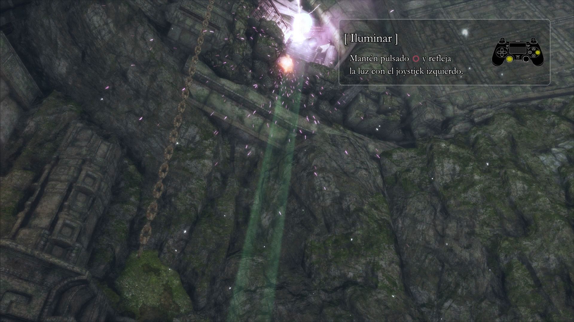 Después de la secuencia cogemos el espejo, y ahora hay que intentar darle de comer cuatro barriles a Trico. Si nos fijamos cerca hay una cadena, pues en la parte de arriba hay unos escombros que debemos eliminar, apuntando con el espejo hasta que la cola de Trico dispare.