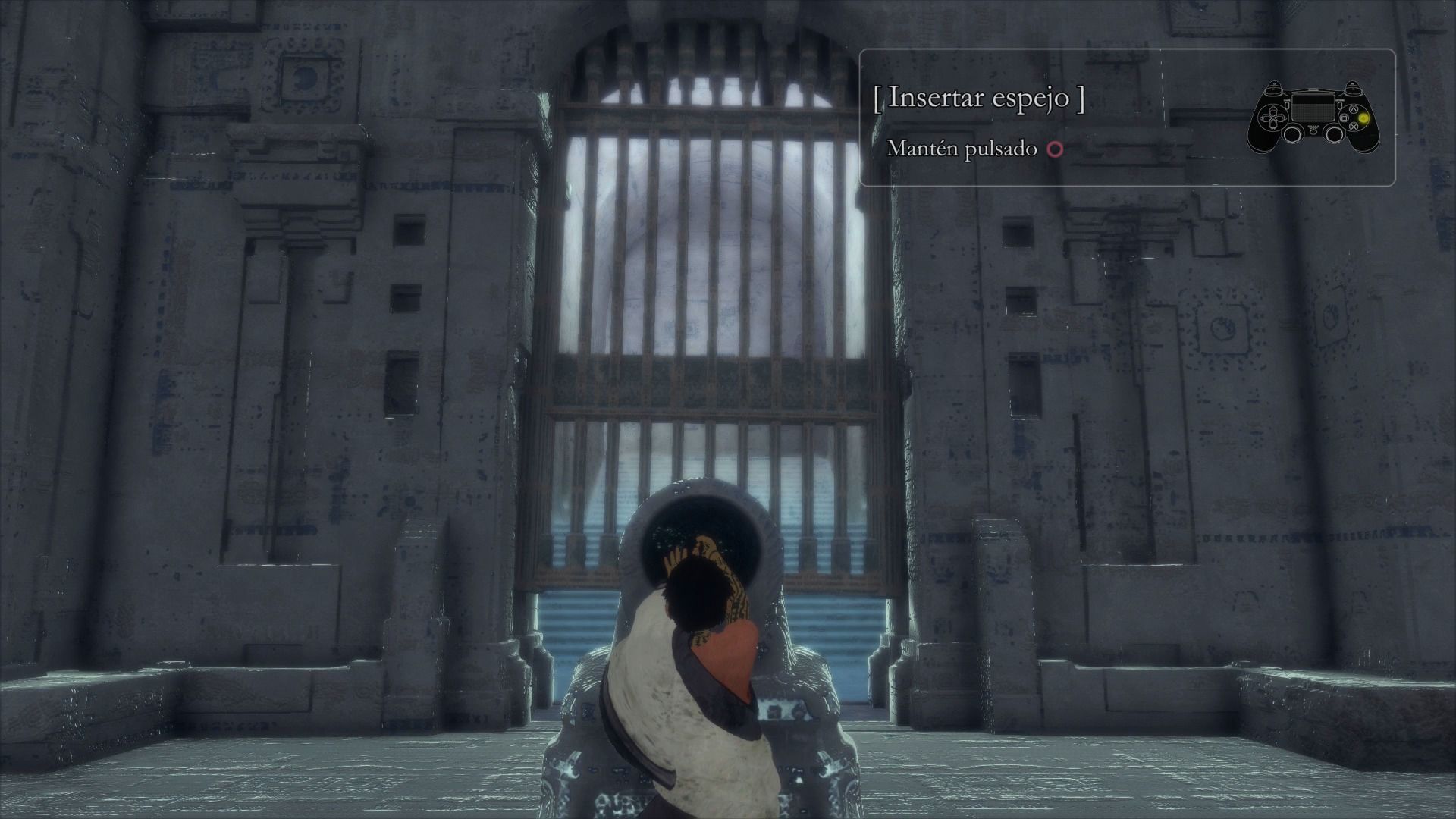 Entramos en la torre y llegamos hasta un ascensor, en el que debemos introducir el espejo para que se active. Descubriremos que hay un techo que nos impide avanzar, así que lo que tenemos que hacer es agarrar la cola de Trico pulsando círculo, y descender por uno de los agujeros del suelo, como si de una cuerda se tratara.