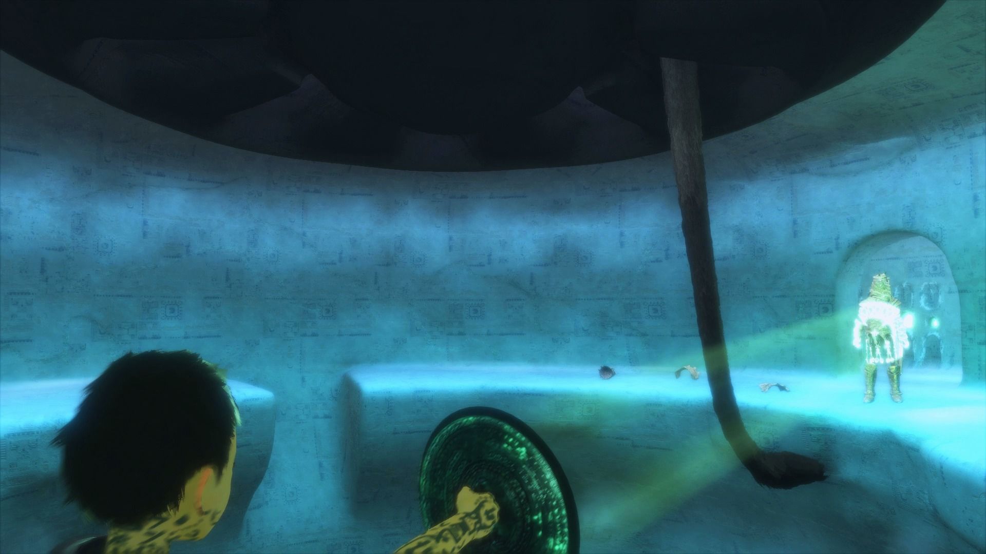 Después de esto apuntamos en lo alto del techo a un símbolo circular, y un ascensor descenderá, teniendo que introducirnos. Llegaremos a una sala en la que debemos dar de comer un barril a Trico, y después subirnos a él y animarle a que realice varios saltos hacia la parte superior de la sala. Llegaremos a un lugar en el que no podemos avanzar, por las aspas de un ventilador gigante, así que tenemos que bajarnos de Trico. Si nos fijamos justo en la pared que tenemos enfrente, hay un agujero en el que se debe introducir el niño.