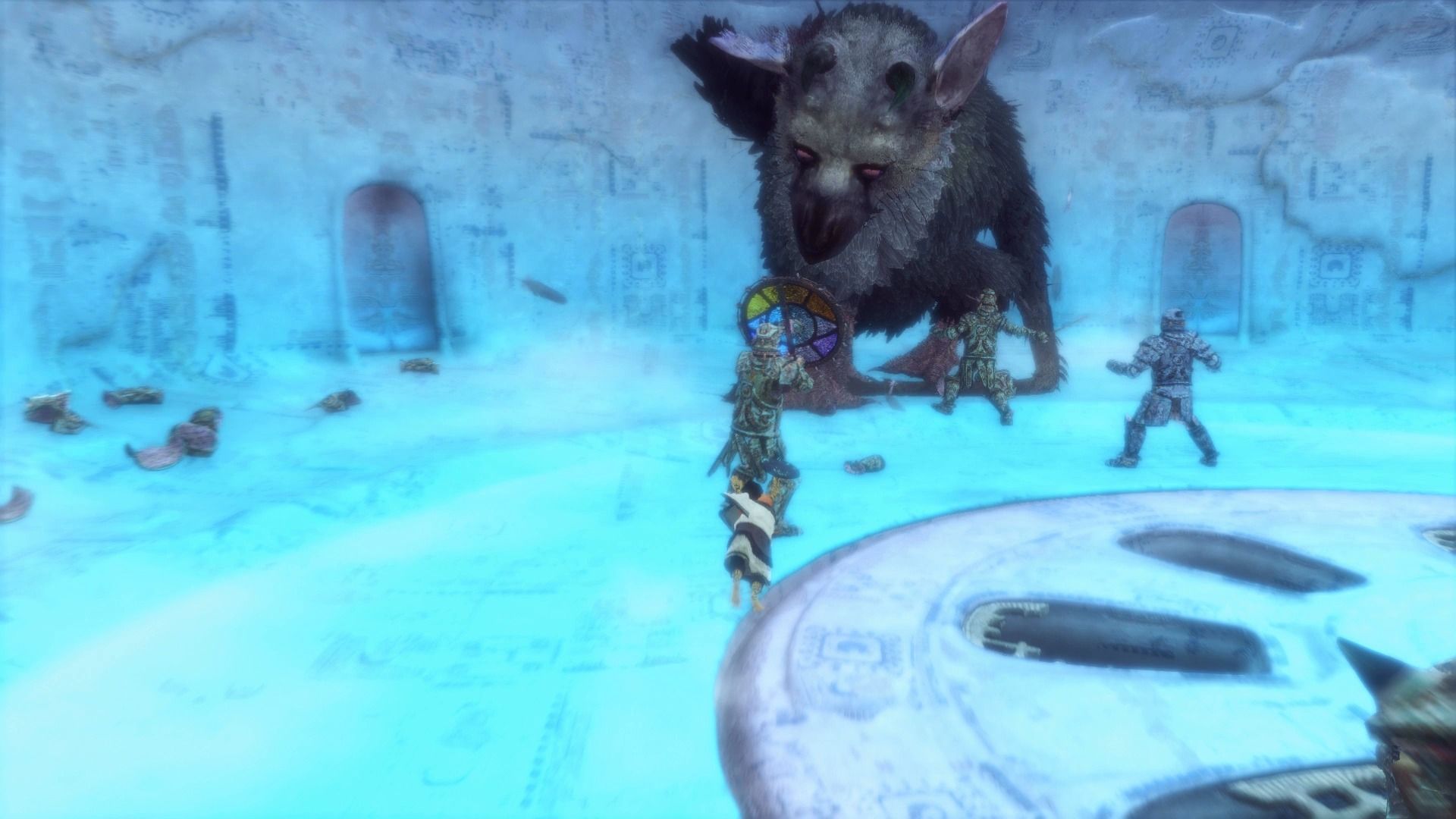 Cuando hayamos activado los 8 interruptores nos volveremos a agarrar a la cola de Trico y subiremos arriba. Activamos el ascensor que comenzará a subir, y al llegar arriba tendremos un duro combate. Aquí lo que tenemos que hacer es primero correr y esquivar a los enemigos para que nunca nos cojan, y ayudar apuntando con el espejo a los enemigos que están en el primer piso, para que Trico los disparo. Sobre todo, lo que es muy importante es que cuando aparezcan enemigos armados con los cristales de colores, correr hacia ellos y empujarles con el botón cuadrado, para que se rompa este artefacto y Trico pueda seguir luchando con normalidad. Es un combate bastante largo y que exige paciencia, pero no es difícil.