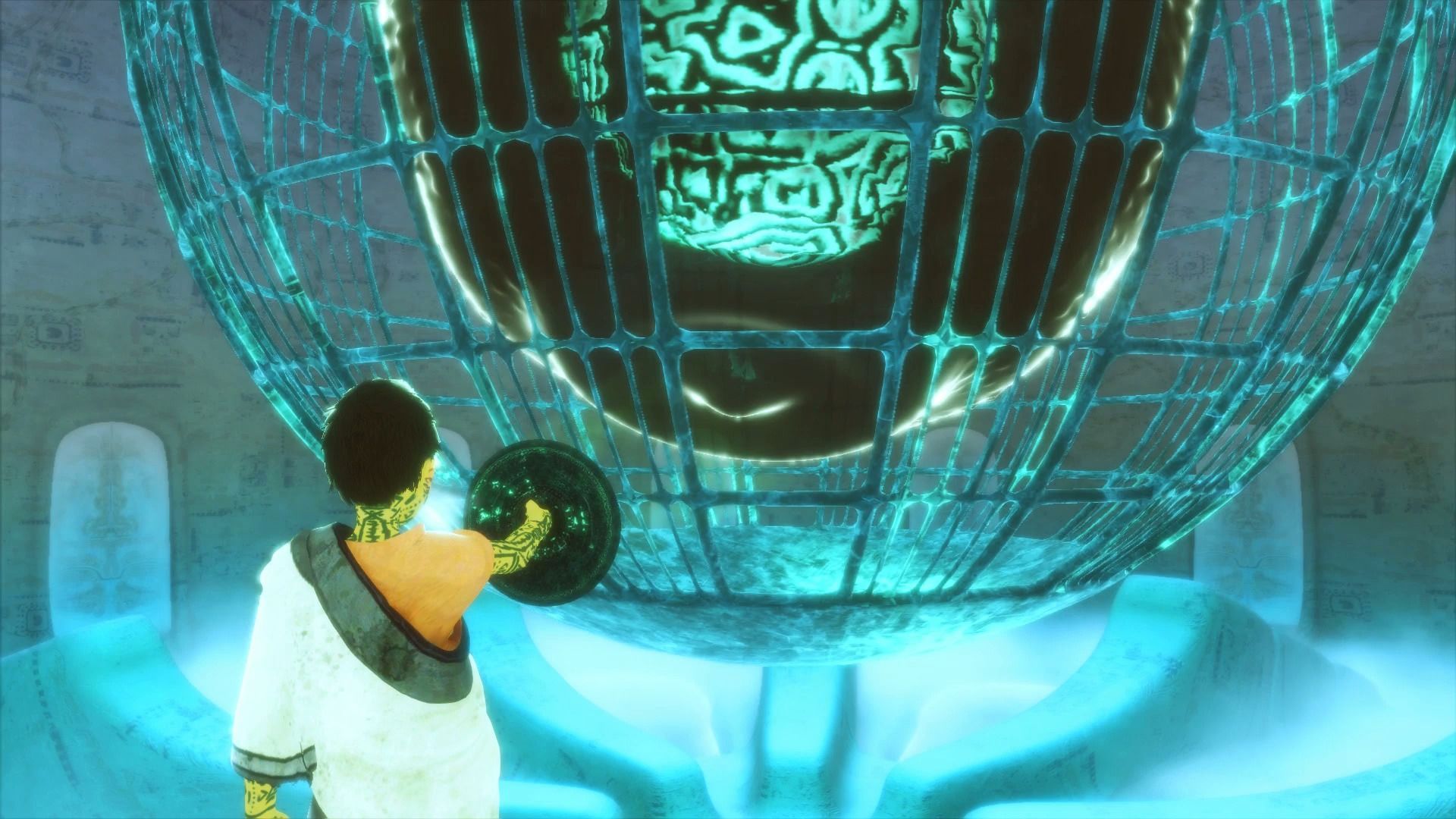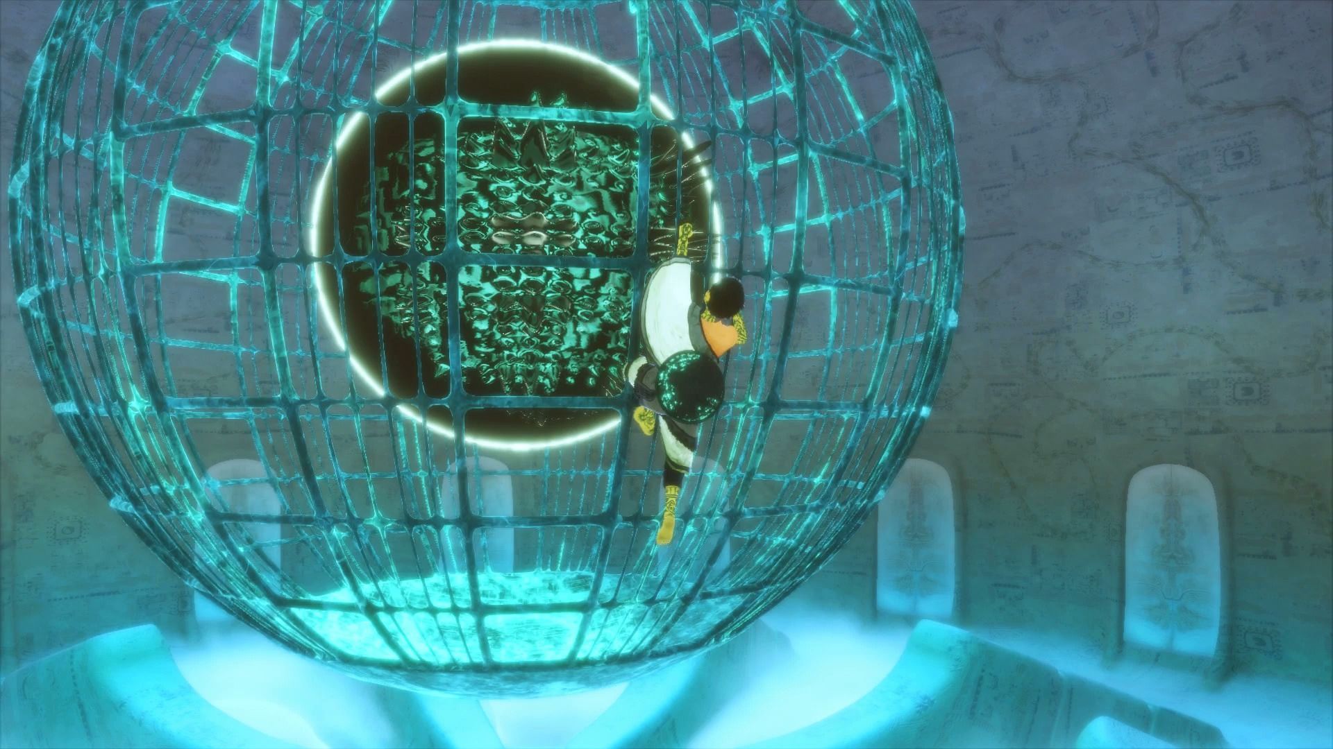 La masa negra irá disminuyendo de tamaño poco a poco, hasta que casi desaparezca, dejando a la vista una jaula esférica que rodea al núcleo. Cuidado cuando estemos reduciendo la masa negra en no apuntar con el espejo al núcleo verde, es importante. Cuando hayamos reducido la masa negra a su mínima expresión, rápidamente hay que saltar hacia la estructura que la rodea, y comenzar a escalar, como veis en la imagen.