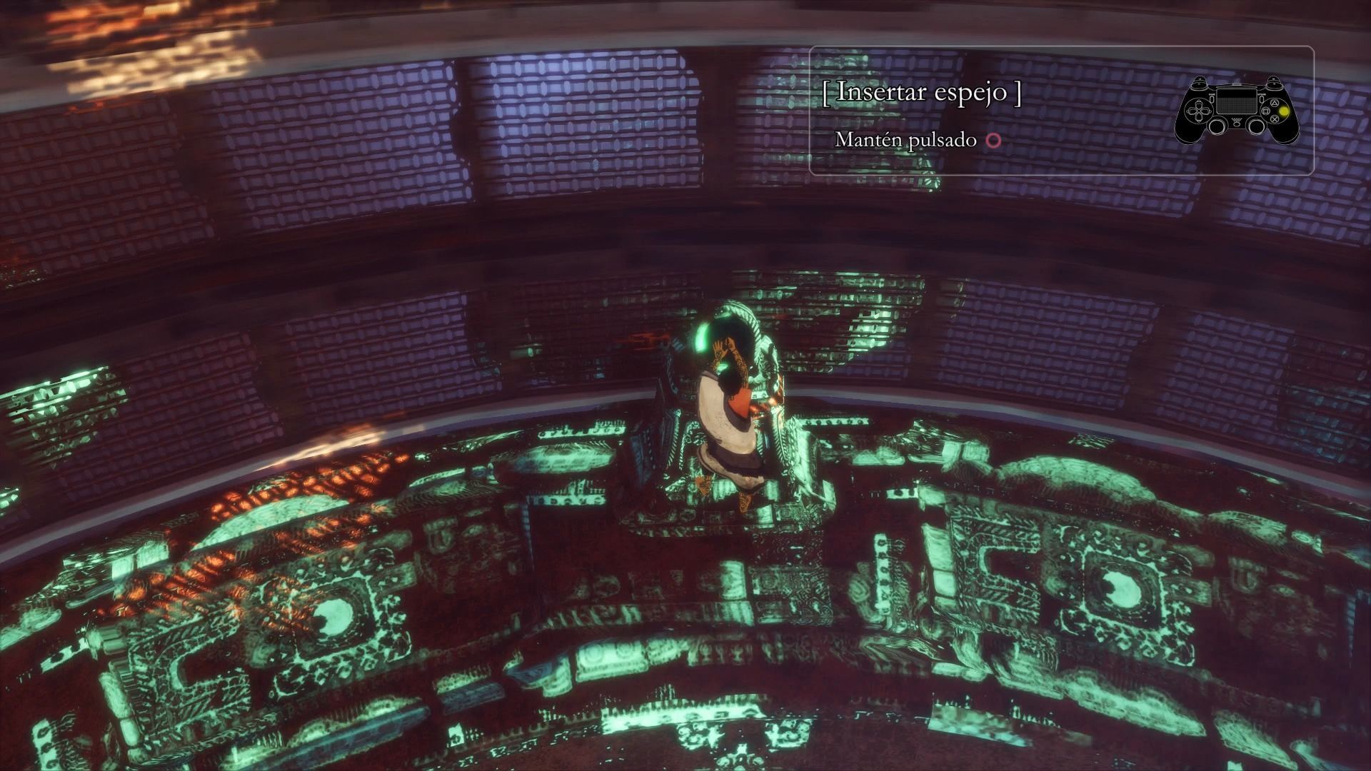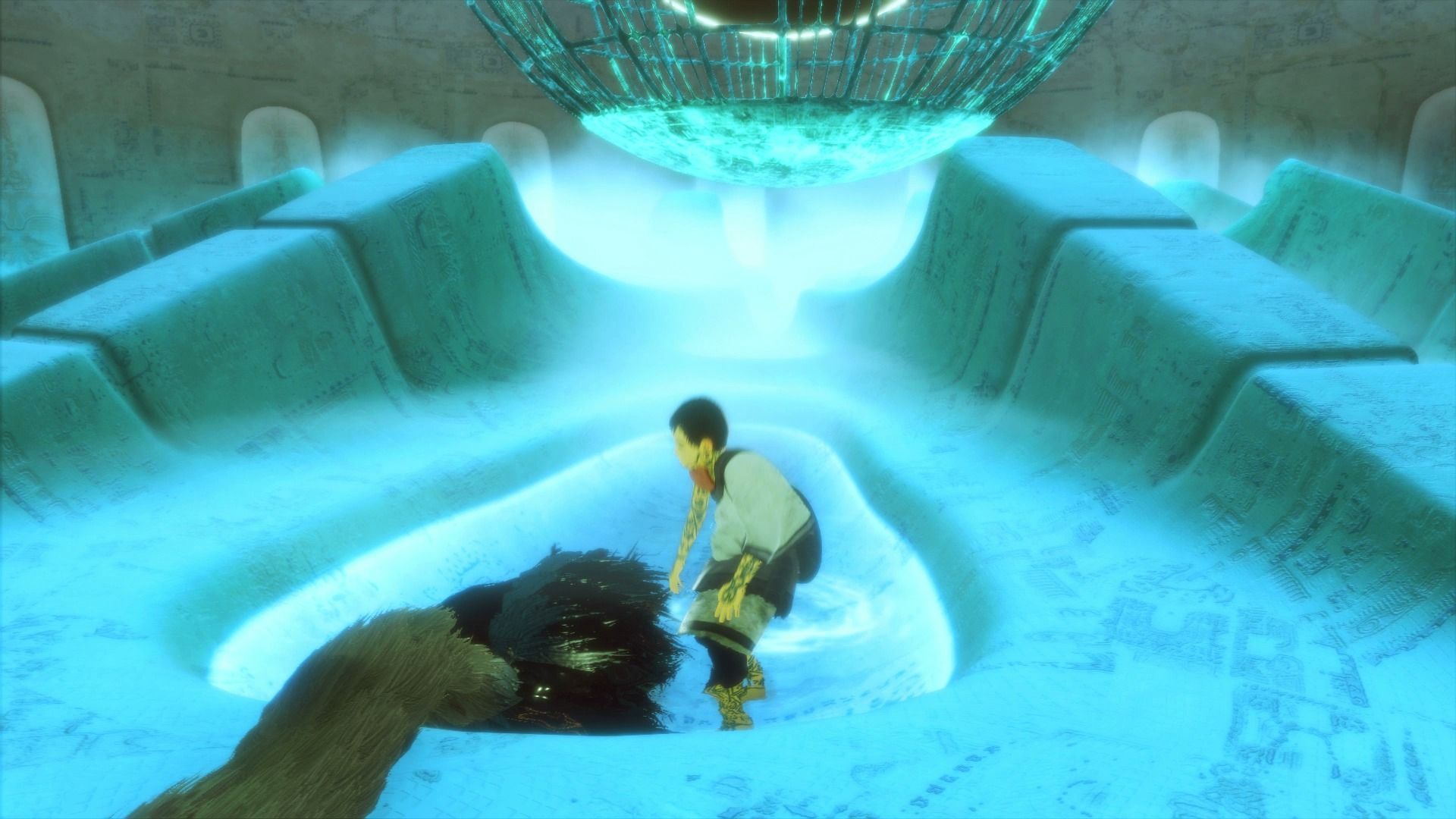 Una vez hayamos cogido el espejo, se activará una cinemática, y ahora lo que tenemos que hacer es entrar en la estructura centrar, coger la cola de Trico, y tirarnos a la zona de abajo con ella, en la sala del núcleo.