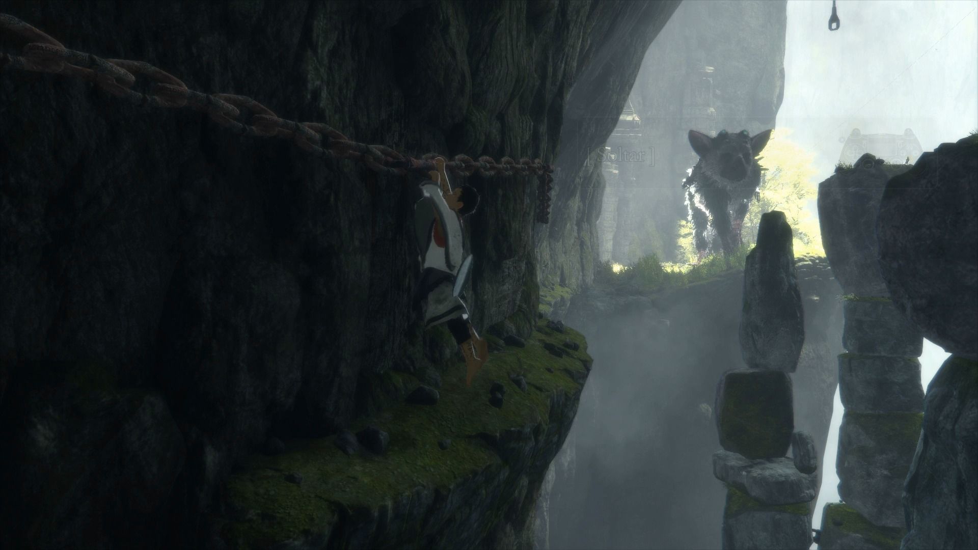 Tras una cinemática, y comprobar que Trico está empeñado en acompañarnos, estaremos en un lugar exterior, de lo que se denomina El Nido. Tenemos que fijarnos que a la derecha según miramos el acantilado, hay un pequeño desfiladero por el que podemos seguir avanzando. Hay que tener cuidado para no caerse, y cuando el suelo se corta, agarrarnos a una cadena para seguir avanzando.