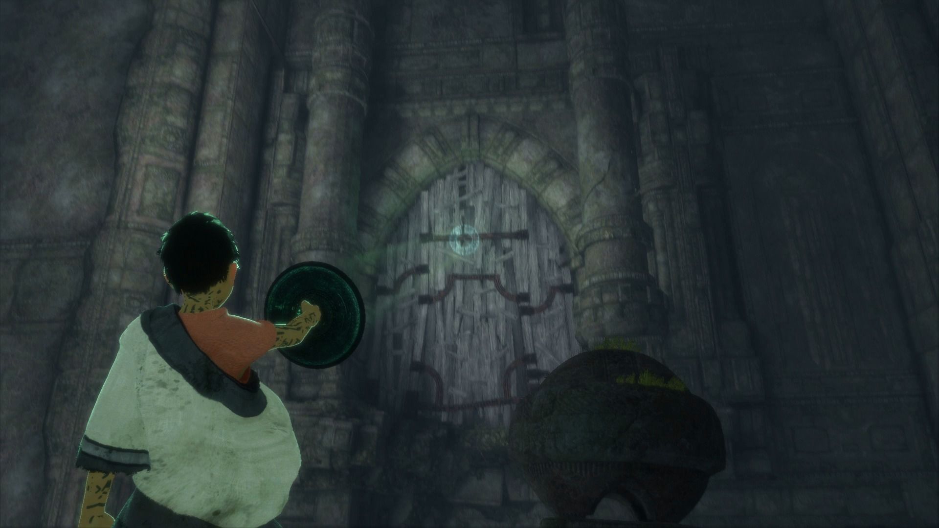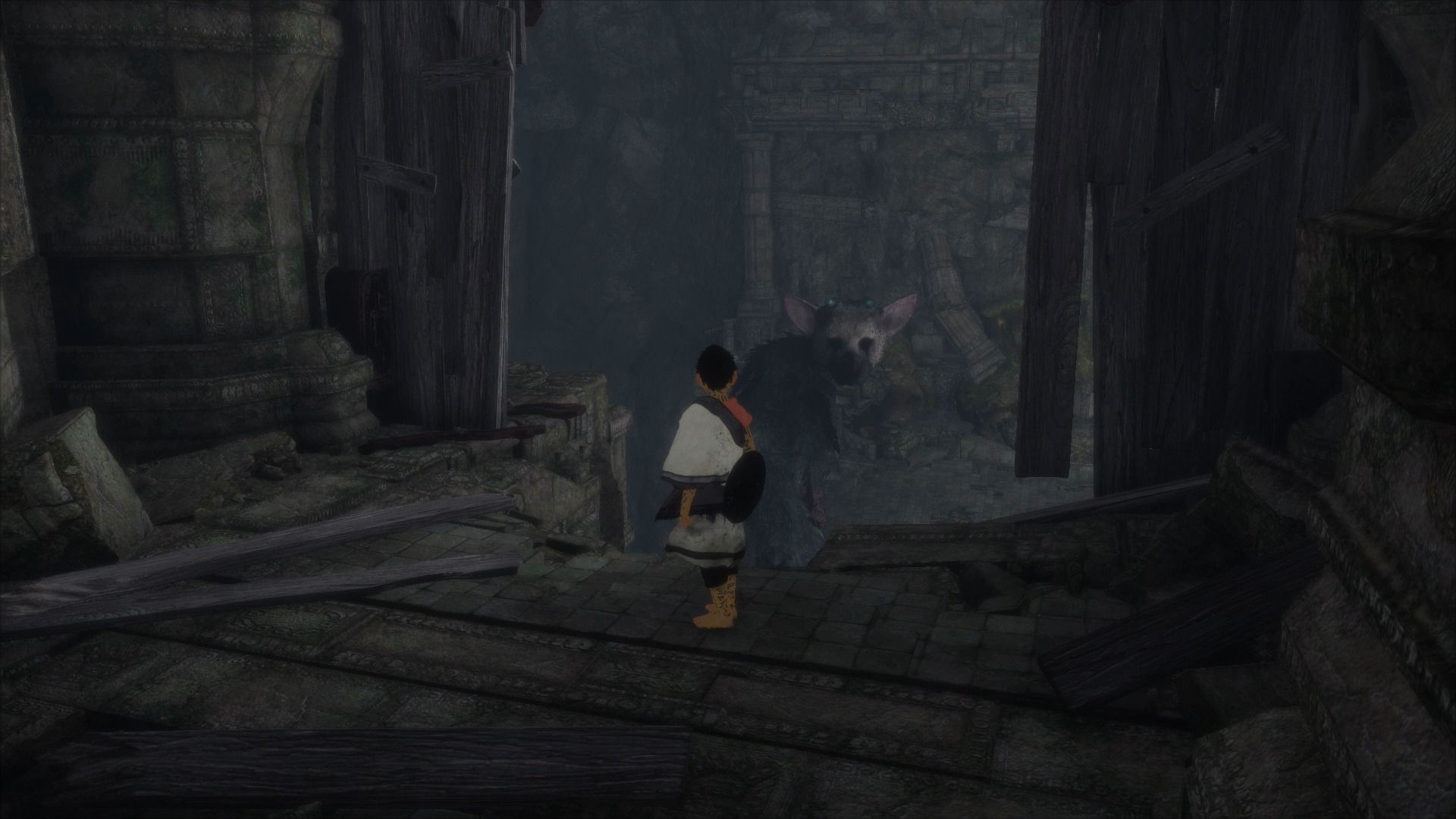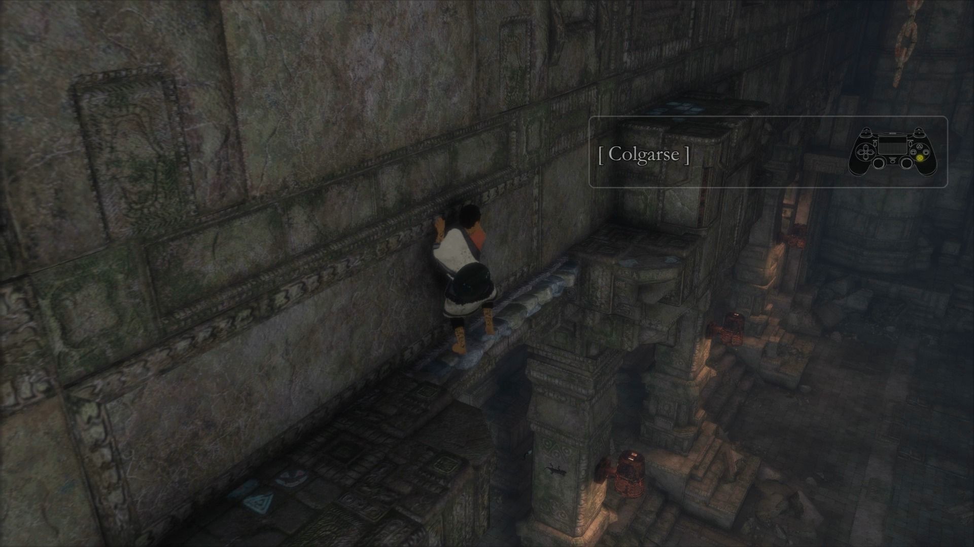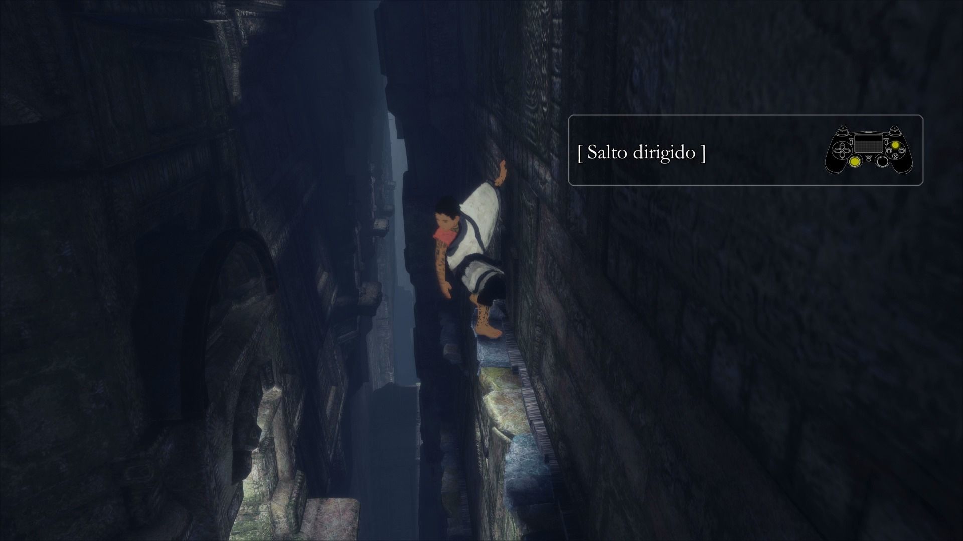 Cuando hayamos atravesado el pequeño desfiladero, veremos que Trico tiene sus reticencias a saltar sobre una inestables plataformas, pero podemos animarle pulsando R1. Una vez que volvamos a estar juntos, veremos al otro lado de donde nos encontramos una enorme puerta de madera, a la que tenemos que apuntar con el espejo, y esperar a que Trico dispare. Cuando lo haga, la puerta se destruirá, y con ella caerá un enorme pilar de piedra, por el que tenemos que descender.