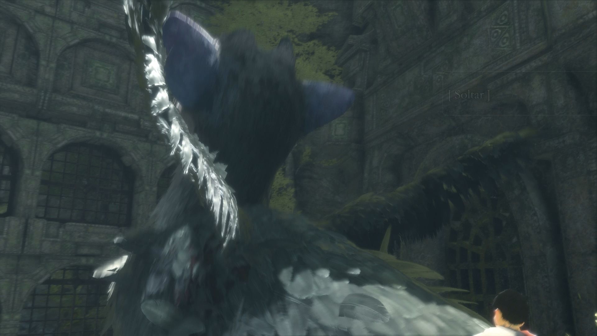 Si seguimos avanzando llegaremos a una sala con cuatro aperturas en un muro, dos abiertas y dos con rejas. Por aquí Trico no puede pasar, así que deberemos entrar nosotros y buscar una manera para que el animal pueda seguir acompañándonos, algo que ocurre constantemente a lo largo del juego. Llegaremos a una enorme sala, y hay que dirigirse a la derecha, y subir por unas escaleras. Por aquí llegaremos a una apertura en un muro, y si no fijamos, veremos la estancia donde usamos el espejo y tiramos la columna de piedra. Desde aquí hay que llamar a Trico con R1, hasta que nos vea y decida saltar, volviendo a estar juntos de nuevo.