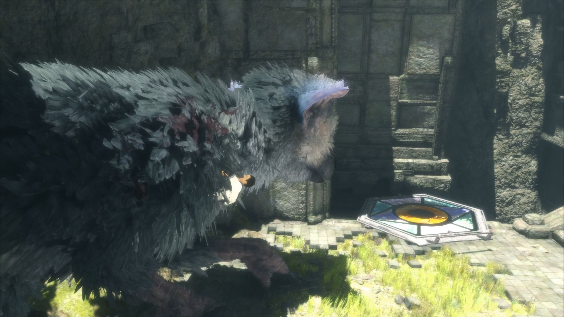 Aquí nos encontraremos en el suelo un vitral, una vidriera de cristales de colores, que a partir de ahora nos encontraremos más veces a lo largo de la aventura. Por algún motivo, Trico teme mucho este objeto, y cada vez que se cruce con él en su camino, no podrá seguir avanzando, por lo que siempre tendremos que intentar romper estos cristales o tirarlos al vacío. En este caso, basta con acercarse, pulsar el botón círculo y empujar el objeto para que se caiga.