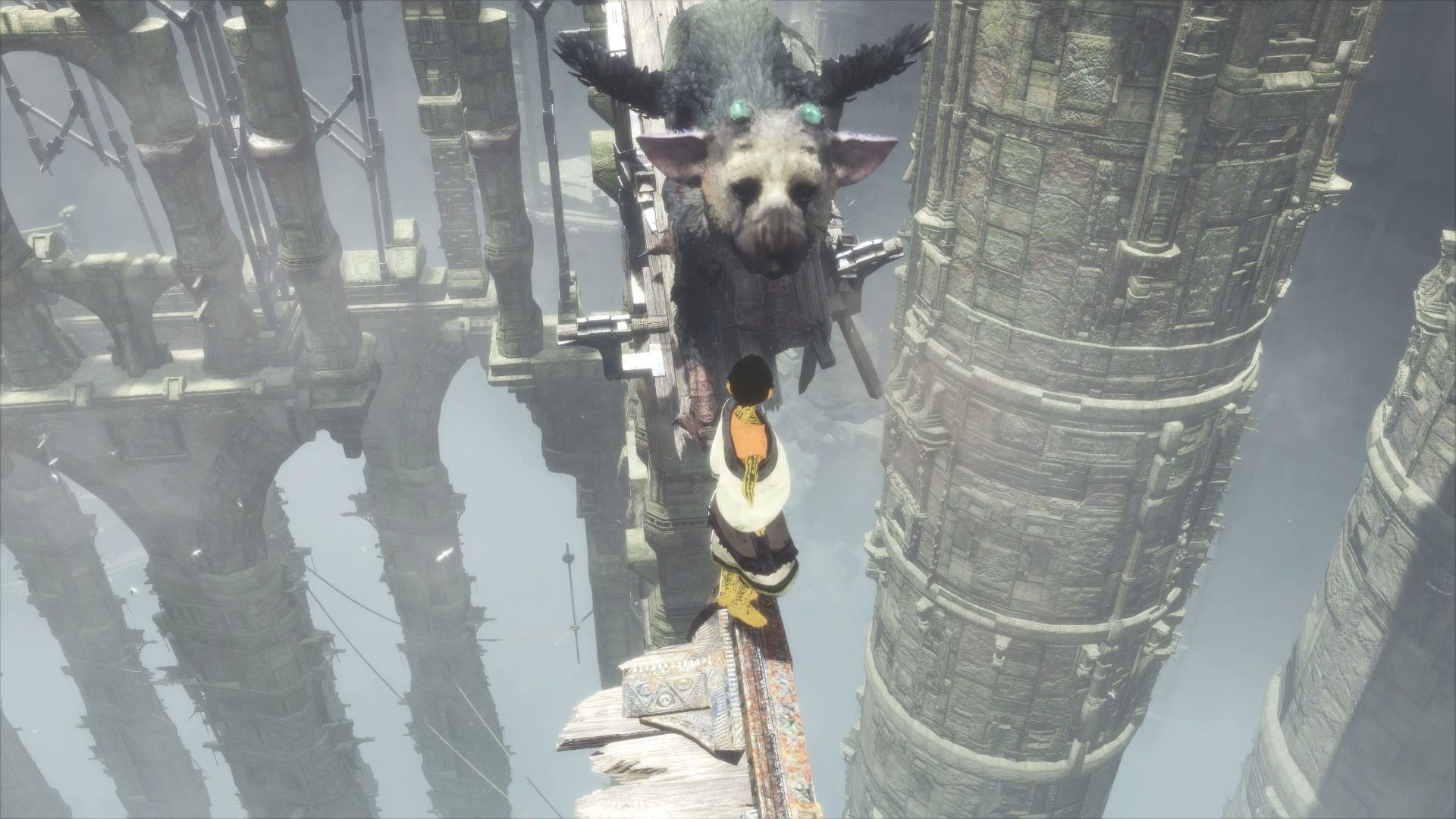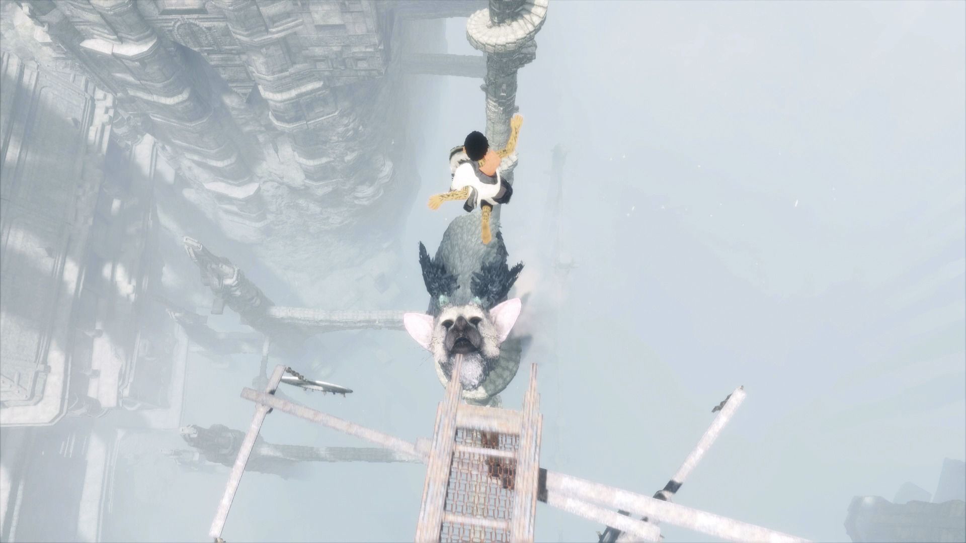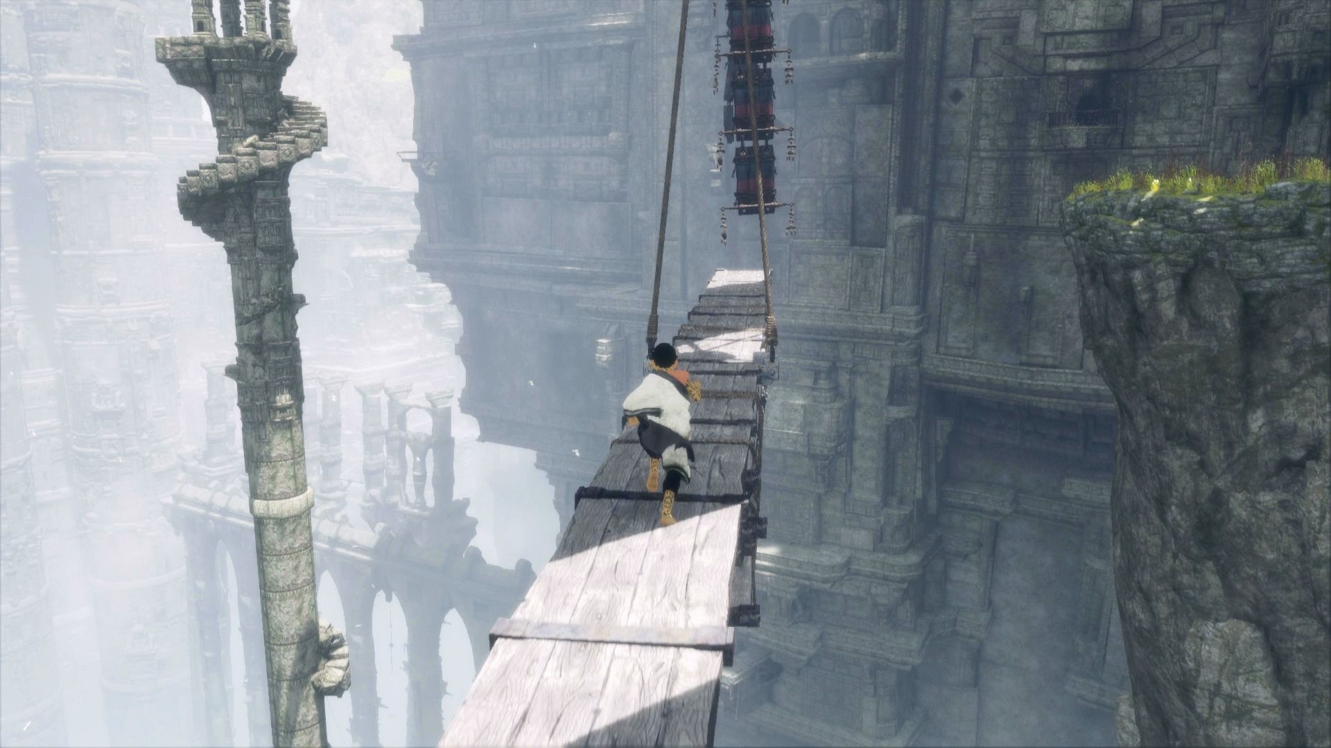 Entramos por la puerta y llegaremos a una serie de vigas de madera suspendidas en el aire, que tendremos que cruzar con cuidado, ya que algunas de ellas se pueden romper. Así llegaremos al final, teniendo enfrente una plataforma, hacia la que deberemos saltar. Nos agarraremos a una barra metálica, pero esta se romperá, y Trico dará un enorme salto y acudirá a salvarnos. Una vez en el cuerpo del animal, subiremos hasta su cabeza, y saltaremos hacia una de las cadenas que sostienen el puente donde está agarrado Trico.