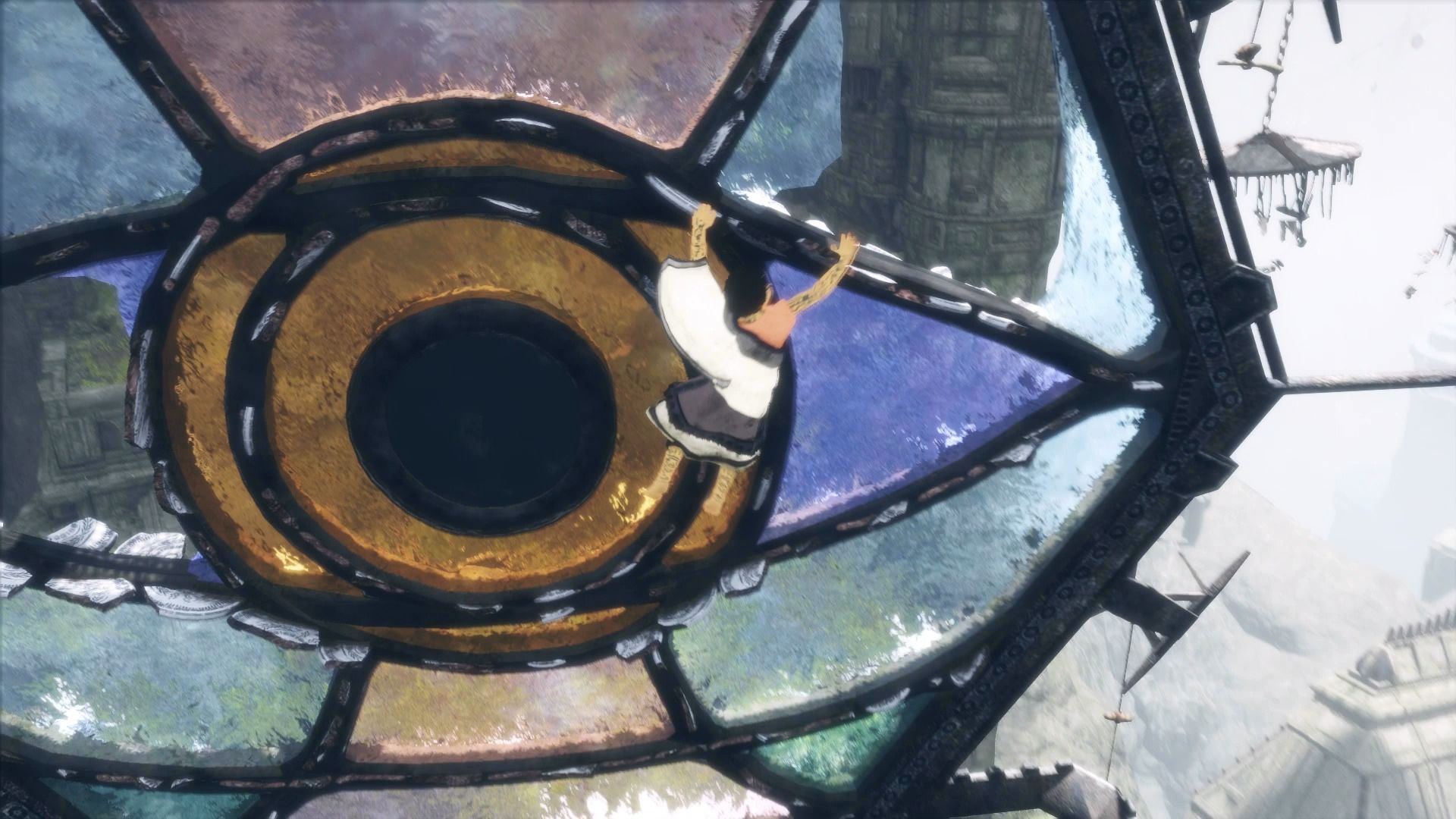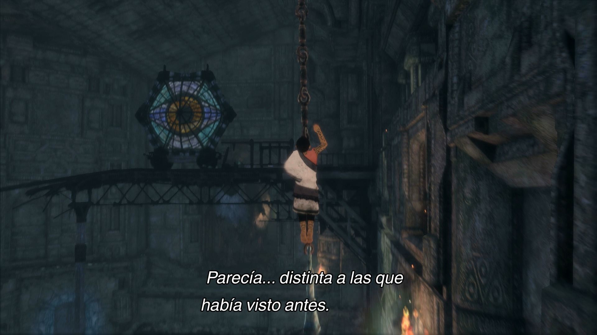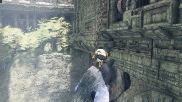 Una vez en lo alto, veremos enfrente una plataforma de madera con una bola metálica a la que podemos saltar, y a partir de ahora tendremos que escalar por las diferentes cadenas que sujetan las vigas metálicas, hasta llegar a un lugar muy elevado, con una pasarela. Si andamos por ella, nos encontraremos con un dispositivo que podemos empujar, que es el que sostiene la vidriera rota que escalamos hace un rato, y que tenemos que tirar al vacío para que Trico pueda continuar. Una vez que hayamos hecho esto, nos moveremos al otro extremo de la pasarela metálica, y Trico debería aparecer sobre un pilar de piedra en la parte de abajo, así que tendremos que realizar un enorme salto al vacío, en dirección al animal.