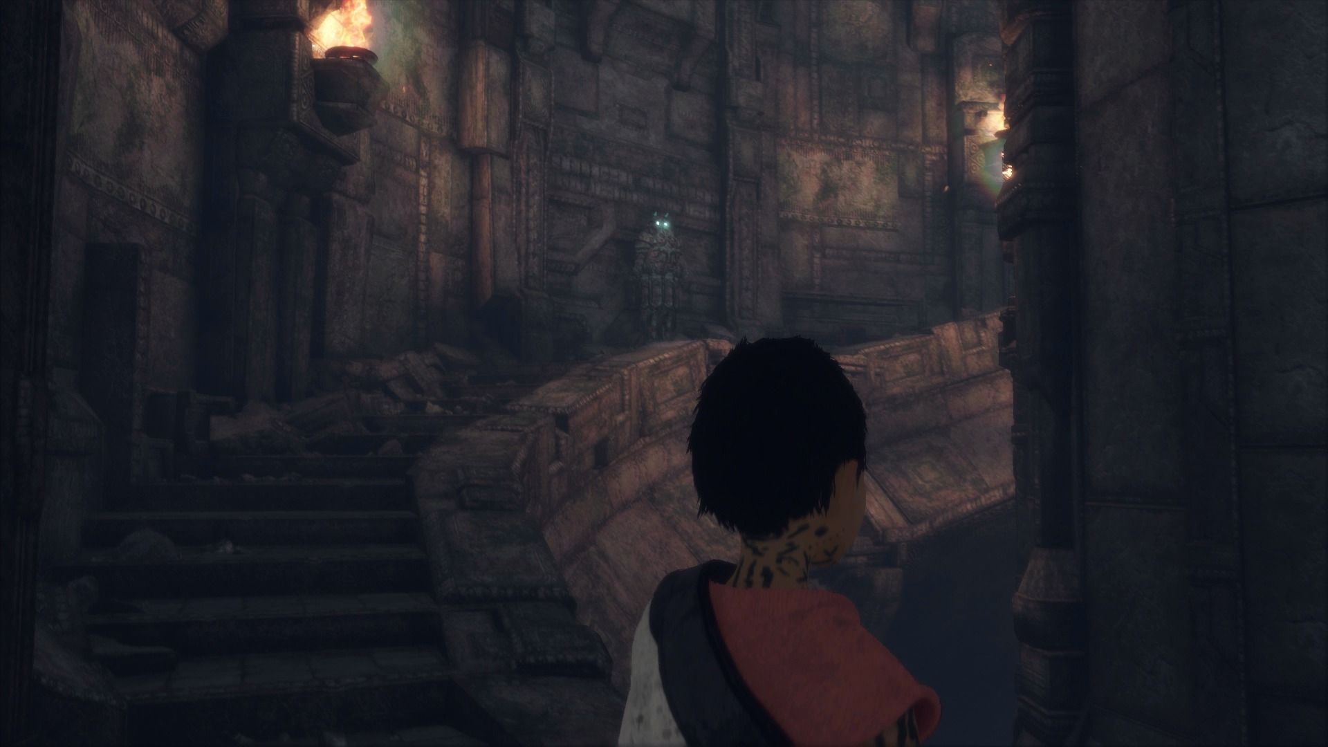 Escalamos, llegamos hasta el muro del edificio donde veremos un pequeño fuego, y a la derecha tendremos una escalera metálica, que debemos bajar rápidamente. Abajo del todo encontraremos un interruptor, que activará la pasarela y permitirá a Trico salvarse. Una vez más el niño y el animal estarán juntos y podrán continuar.