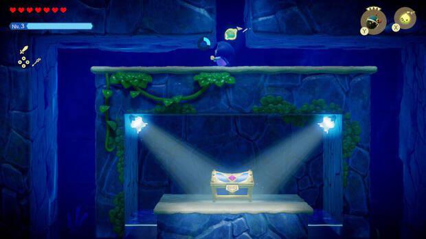 Después de pulsar este botón, regresa al vestíbulo y baja por la escalera del lado izquierdo. Entrarás en una cueva en 2D que está a oscuras. Avanza buceando hacia la izquierda y esquivando a los distintos monstruos. Puedes abrir el mapa para consultar dónde está la salida si te desorientas. Antes de ir hacia ella, eso sí, no olvides que hay un cofre en esta sala que contiene 100 rupias.