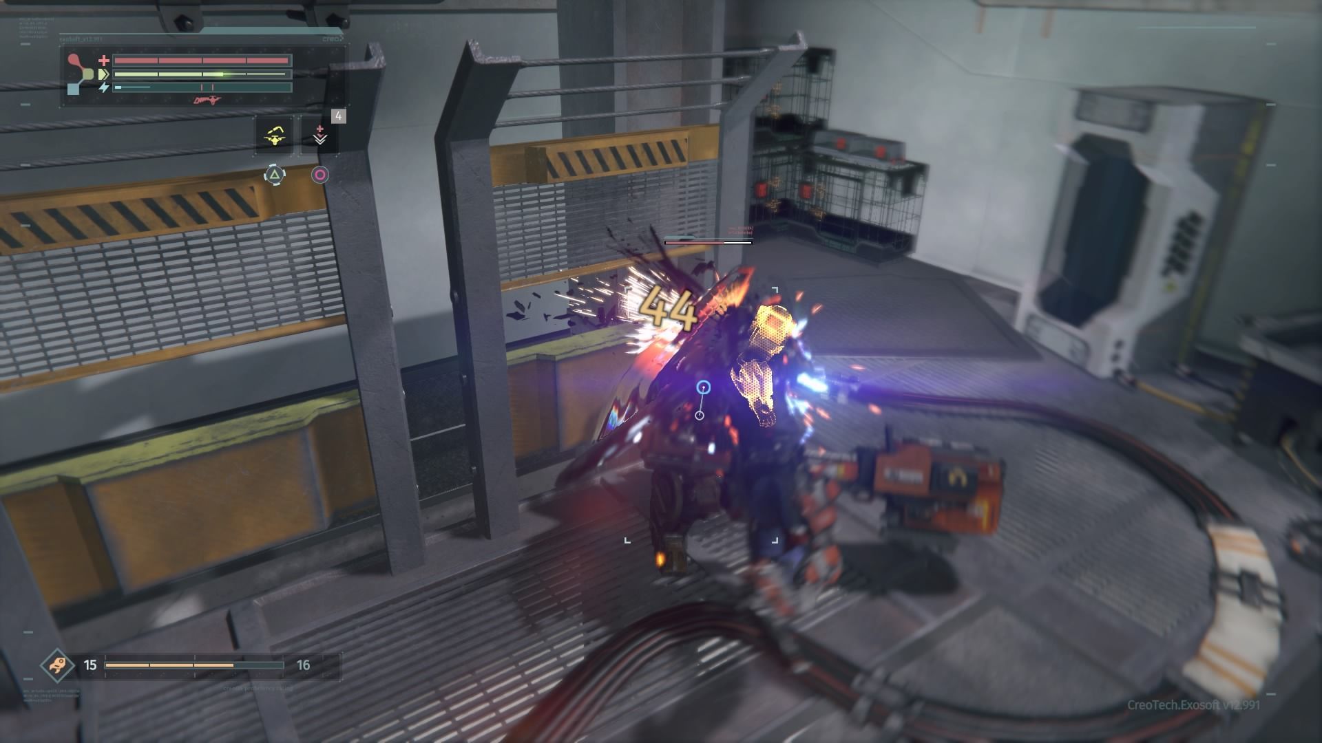 En The Surge, cuentas con un sistema de apuntado por partes para los enemigos. En amarillo/naranja verás aquellas partes que están protegidas con escudo. No las ataques: busca las partes que se marcan en azul, porque golpeándolas causarás bastante más daño a los rivales.
