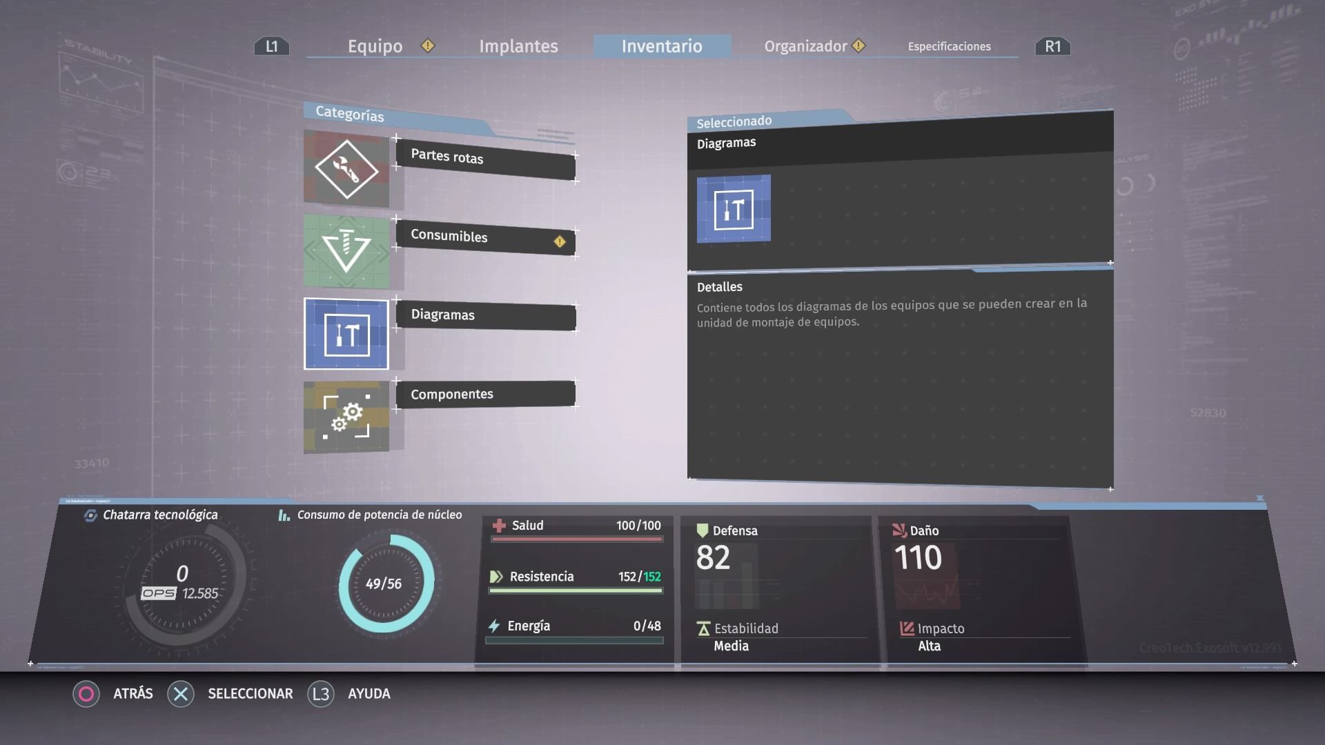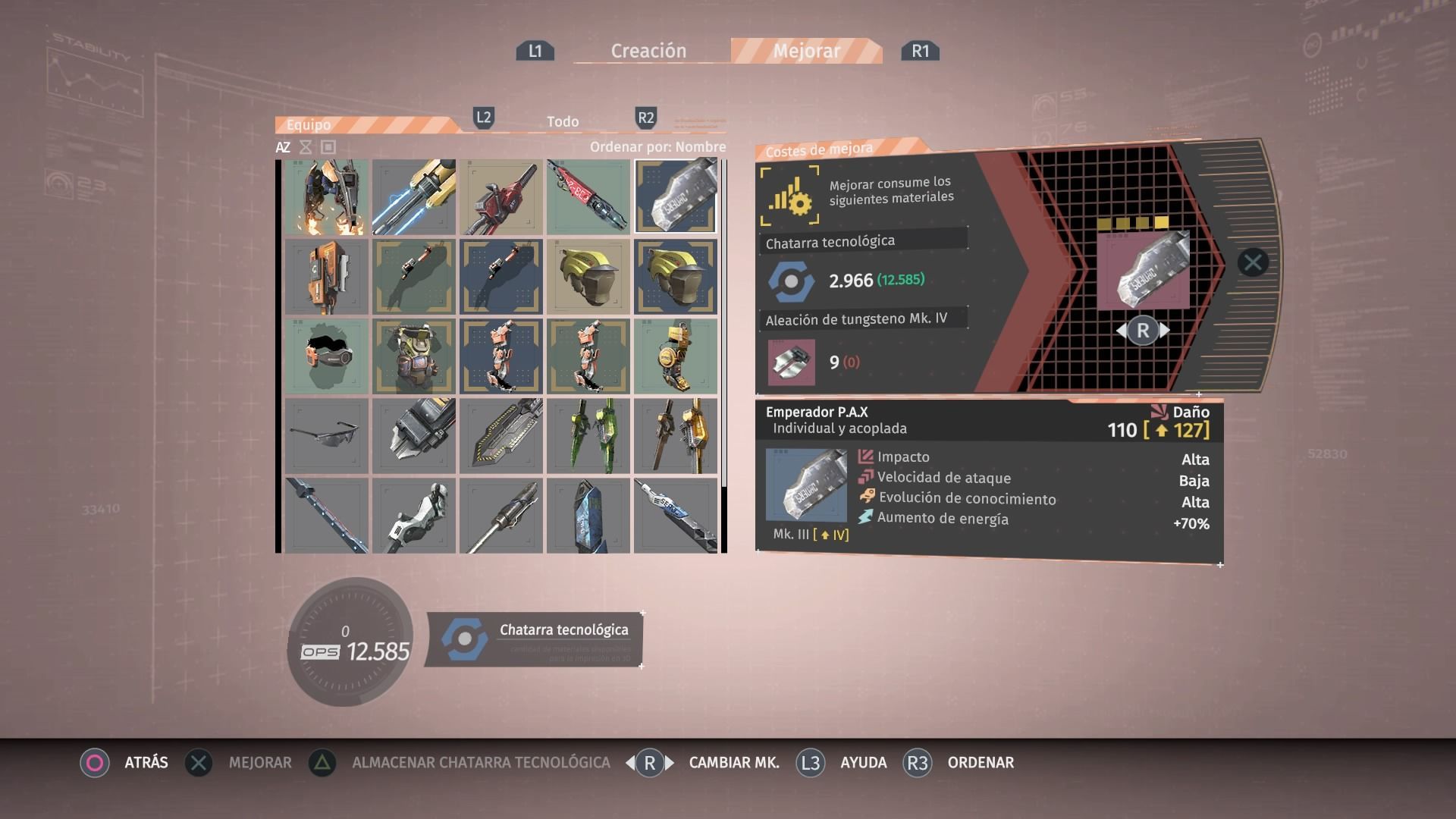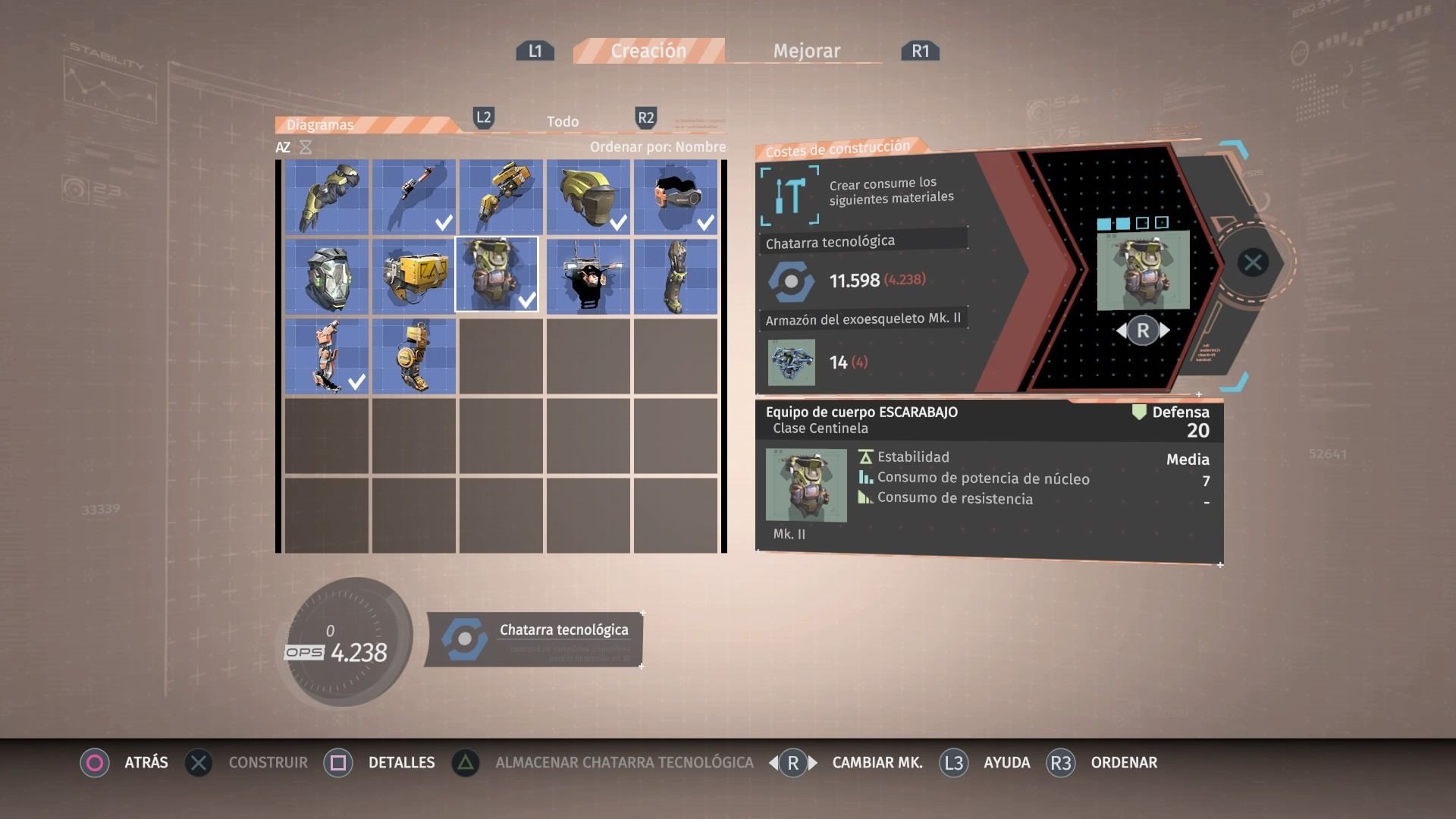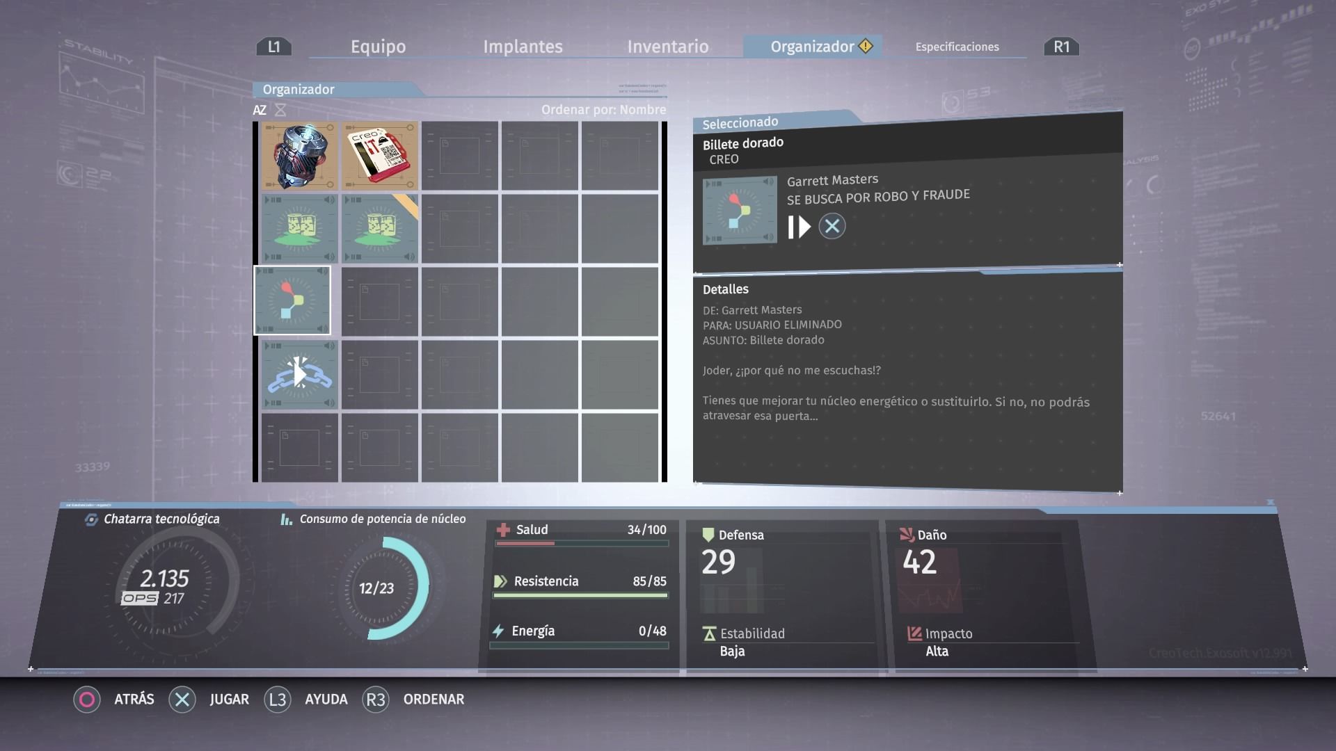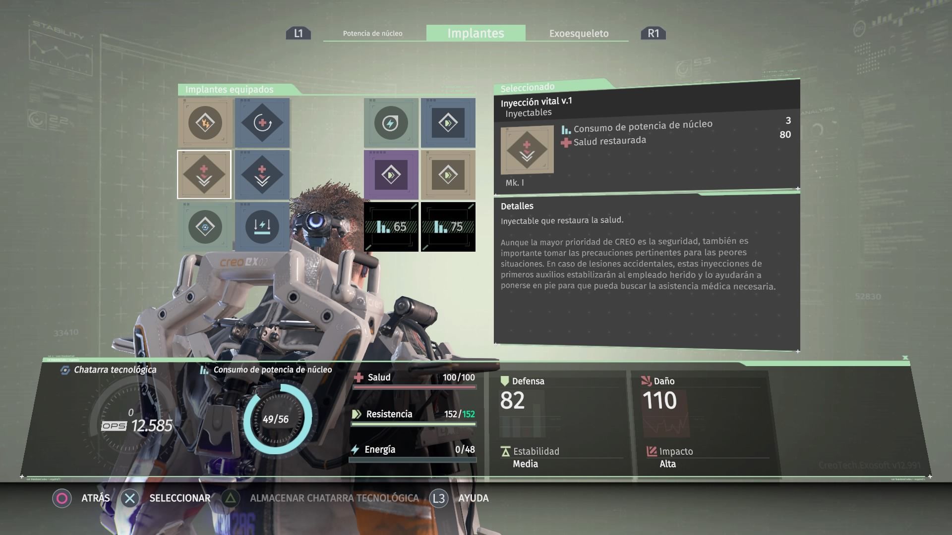 Con la chatarra podemos mejorar el núcleo subiendo su nivel para poder asignar más implantes al exoesqueleto, crear nuevas armas y accesorios o mejorar los ya existentes. Si tienen mucha chatarra encima y no quieres arriesgarte a perderla al morir, puedes volver a la estación de seguridad para depositarla y dejarla almacenada hasta el siguiente uso.