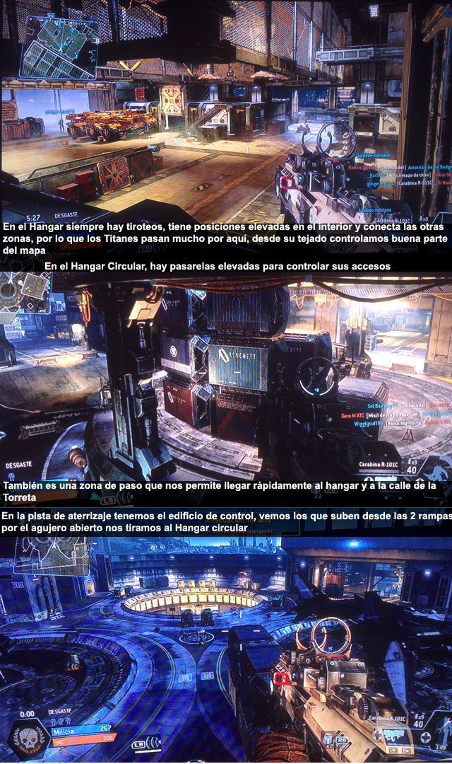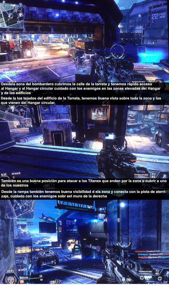 Este mapa es una de los mas divertidos para jugar, como piloto tiene muchos recovecos para esconderse dentro de los diferentes edificios y un montón de zonas elevadas para controlar las zonas y atacar a Titanes. El camuflaje es buena opción, la gente se dirige rápidamente a la zona de la torreta el Hangar y el tejado del Hangar.