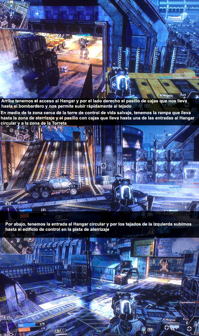 Como Titanes tenemos total libertad para movernos por todo el mapeado, eso sí, hay que vigilar muy bien las zonas elevadas tanto fuera como dentro de los hangares. El humo eléctrico es buena opción ya que aunque apodemos movernos muy bien por todo el escenario es estrecho en muchas sitios.