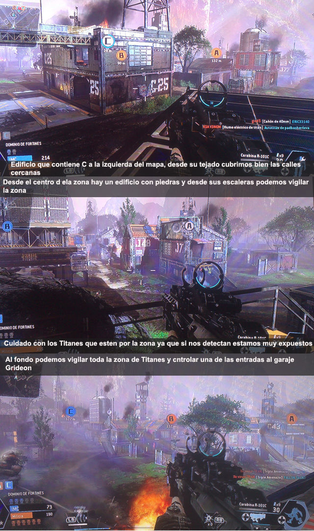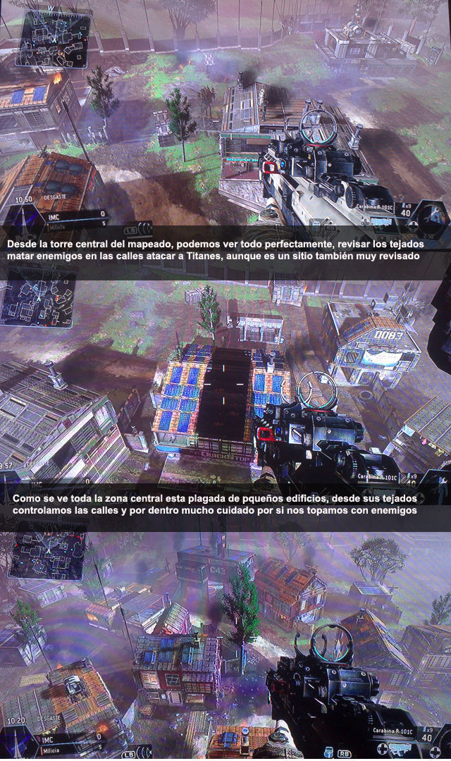 Todo el centro urbano está lleno de pequeños edificios, con dos pisos y ventanas para cubrir las calles. Desde los tejados igualmente vemos bien, atentos a los tejados siempre que salgamos, a la izquierda del mapa tenemos un edifico que contiene C y una de las banderas de Captura. B lo tenemos en el centro arriba dentro del quickstop y A y otra de las banderas de Captura a la derecha del mapeado dentro del garaje Grideon. En el centro de la zona urbana tenemos una torre y desde arriba cubrimos perfectamente todo el escenario y podemos disparar sobre los Titanes a placer. Minimapa siempre, mirar tejados y ventanas y pasar rápido por las calles para no ser abatidos, la escopeta viene bien en toda esta red de pequeños edificios