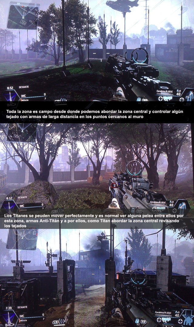 Toda la zona de arriba del mapa es bosque donde los Titanes se pueden desplazarse libremente, aunque ser un blanco muy fácil para Pilotos en posiciones elevadas desde la zona central, también suelen caer cápsulas de espectros y soldados IA para coger algunos puntos gratis.