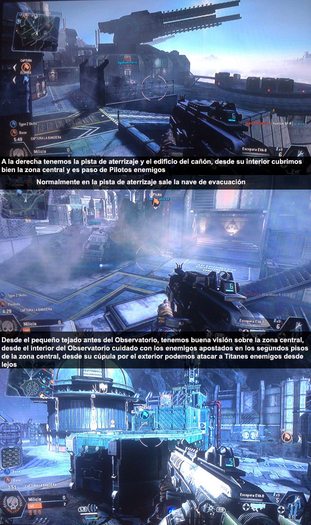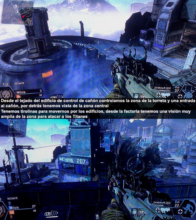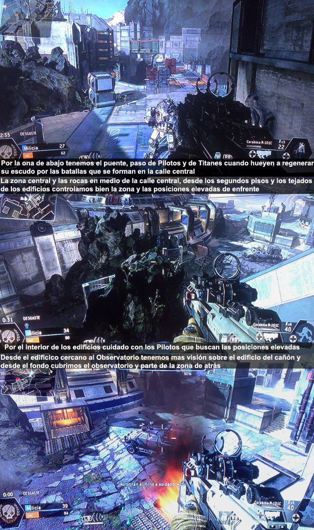 Otro mapa muy divertido de jugar, con muy buen diseño, compacto y con mucha acción. Entre sus edificios, los interiores y los tejados, y la movilidad que tiene para los Titanes. En toda la zona central hay que estar muy atentos a las ventanas y posiciones elevadas de los edificios, el pasillo al aire libre del edificio del cañón y los balcones de la armería. El mapa cuenta con posiciones elevadas para atacar a Titanes a distancia por todas las zonas, cuando veamos que hay varios en el minimapa nos subimos a ellas para atacarlos. Siendo Titán nos podemos mover libremente y en la zona central causaremos muchas bajas de espectros y soldados IA, pero también muy expuestos a los Pilotos. Lo bueno es que podemos protegernos rápidamente bordeando algún edificio, el humo eléctrico viene bien en esta pantalla.