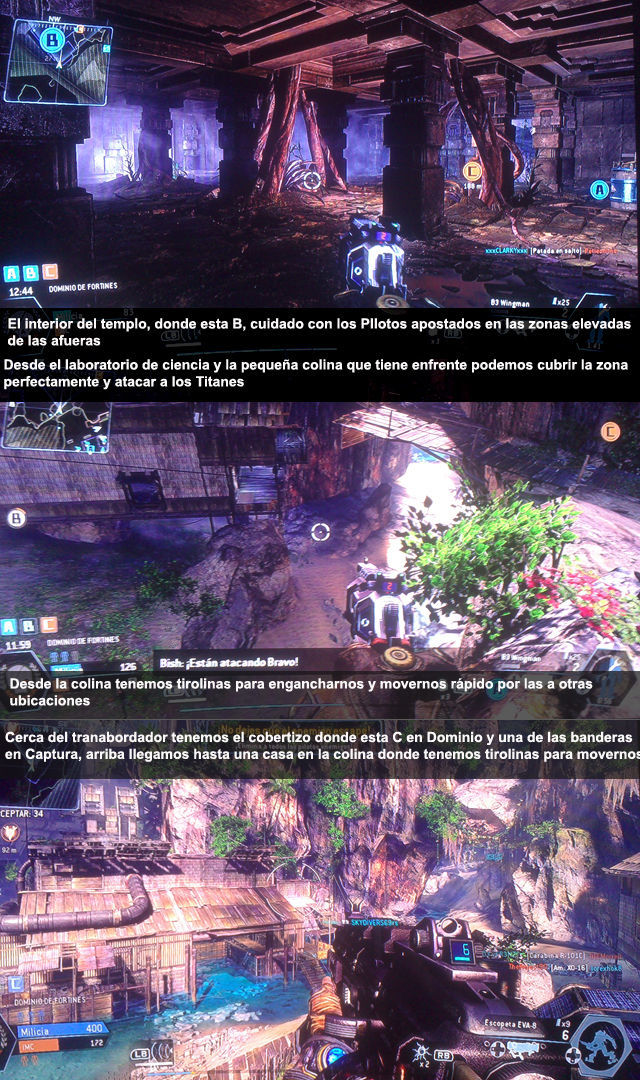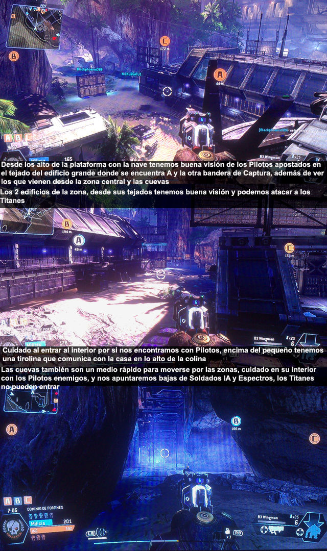 En este mapa es muy importante el uso de las tirolinas para moverse entre las distintas zonas y posiciones elevadas para eliminar enemigos, en el centro tiene las cuevas, que dan acceso a todas las zonas y donde los Titanes no pueden entrar.
