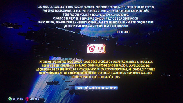 Cuando lleguemos al nivel 50, nos sale esta opción para reiniciar al jugador pero con una generación más, nos quitan todo menos las cartas y los Titanes desbloqueados en el modo historia, eso si cada vez que subamos de generación acumularemos más rápido los puntos de experiencia.