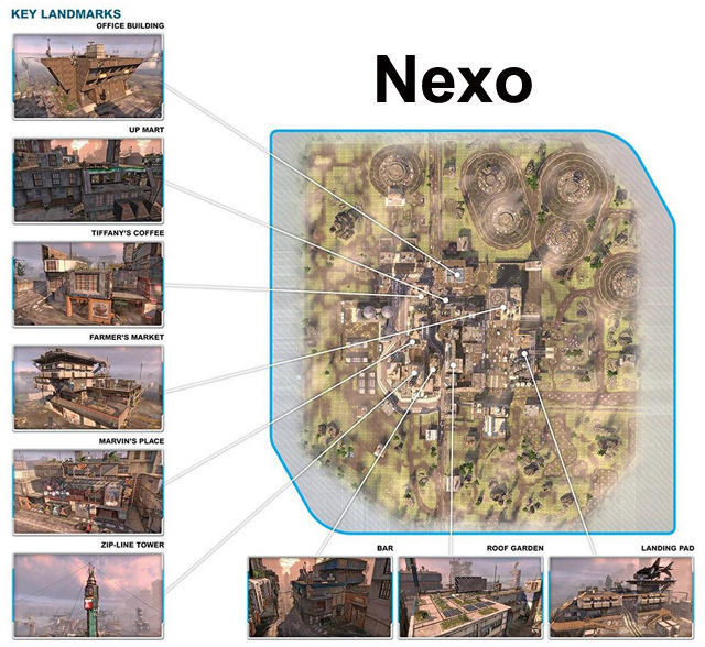Nexo es un mapa con un núcleo urbano en el centro con bastantes edificios y dos torretas y las zonas que lo rodean muy abierta para los Titanes. Como Pilotos, tomar las posiciones elevadas de la zona central y mucho cuidado en el interior de los edificios. Activar las Torretas contra enemigos y atacar a los Titanes desde posiciones elevadas camuflados entre los tejados.