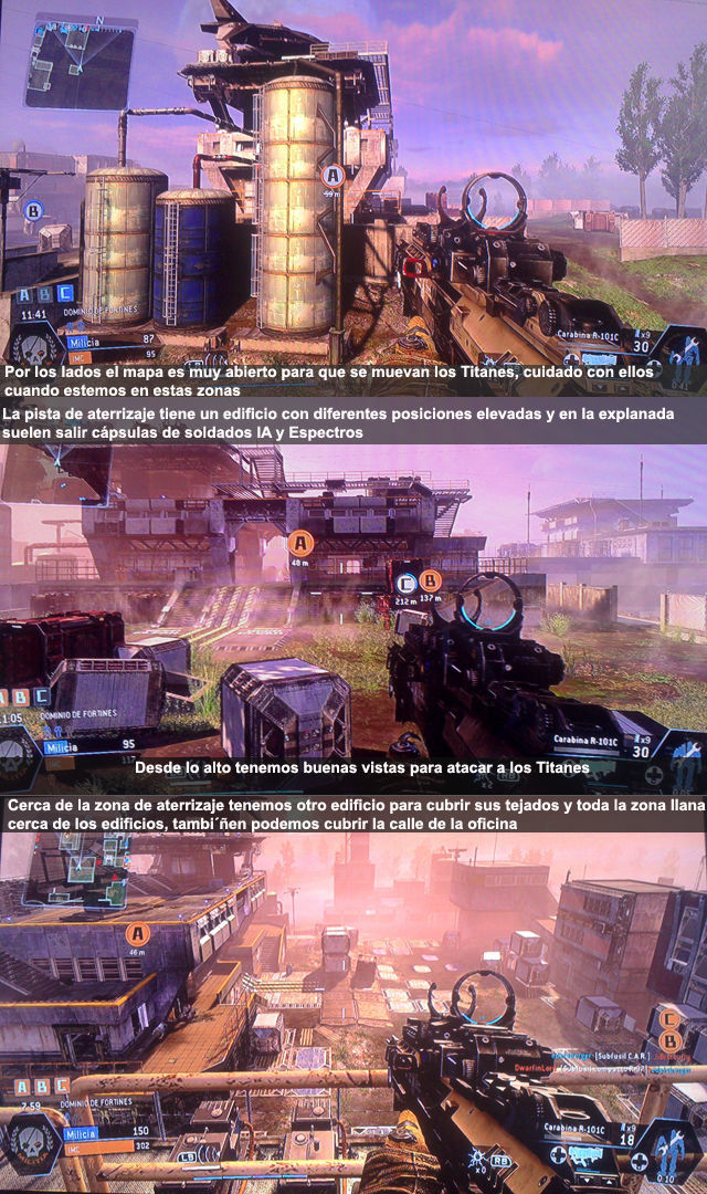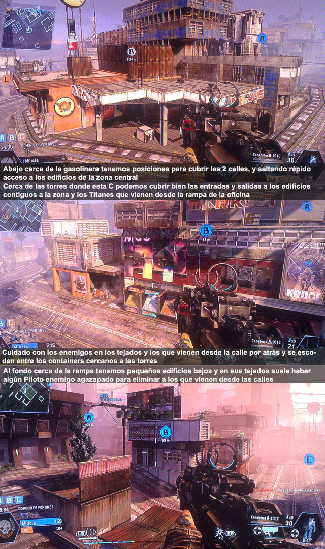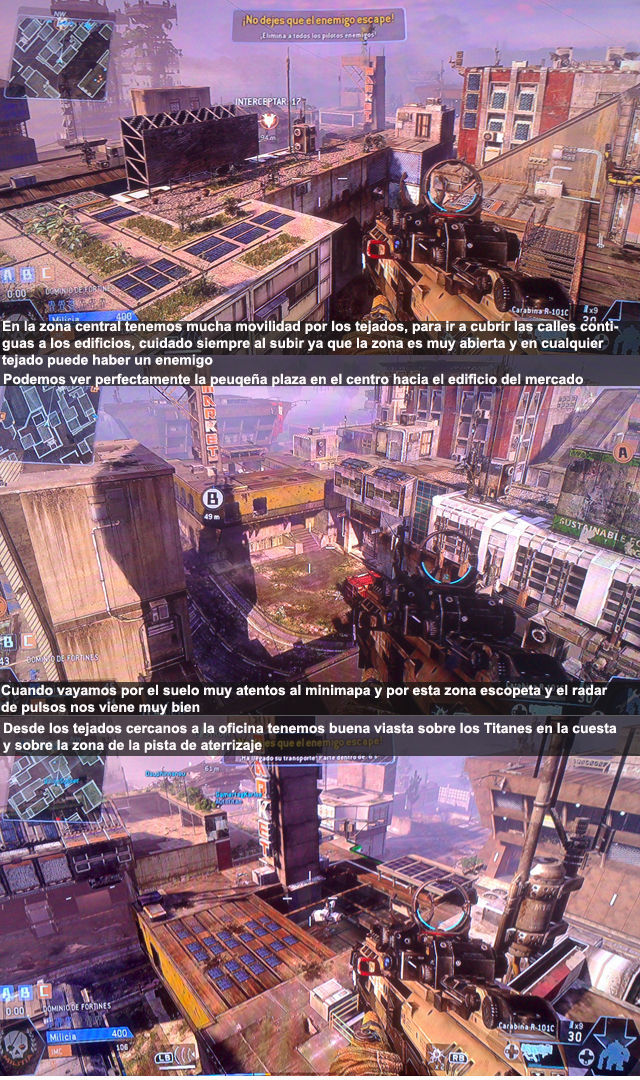 Los Titanes tienen mucha movilidad por las 2 zonas que rodean al centro de edificios y tras las calles tenemos campo para movernos a nuestras anchas, cuidado con los enemigos en los tejados