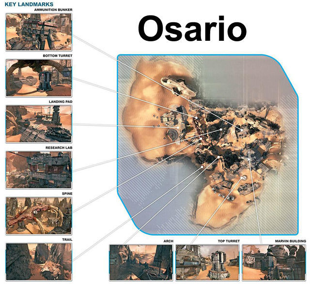 Osario es un mapa bastante amplio y con muchos recovecos para esconderse y coger desprevenidos a los enemigos. El uso de tirolinas también es muy importante en este mapa, ya que las distancias son largas y entre un edificio y otro hay tramos donde somos muy vulnerables a los Titanes. Tiene muchos niveles de altura, ya que podemos ponernos sobre los huesos o llegar a rincones muy buenos tras eyectarnos del Titán.
