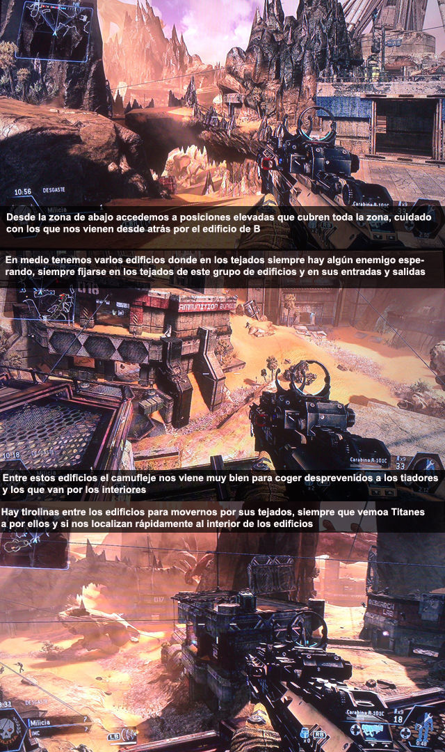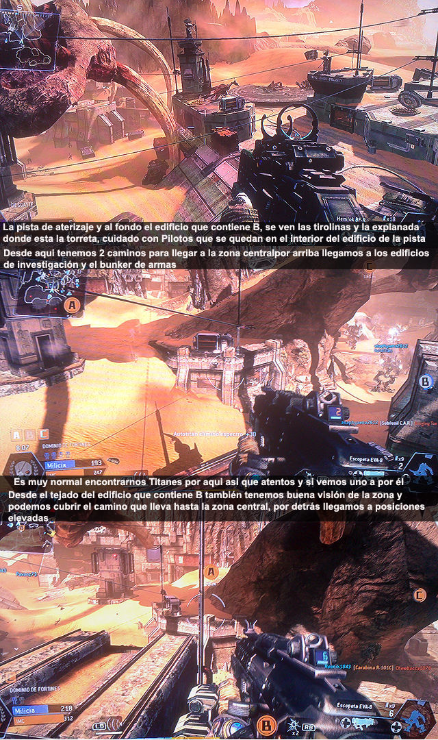 En medio tenemos varios edificios, arriba del todo esta el A en dominio, cerca dos edificios el Bunker de Munición y el laboratorio de investigación. Desde los tejados de ambos podemos cubrir bien la zona en busca de enemigos y Titanes. Hay tirolinas que comunican los edificios, cuidado siempre con los que se ponen en el tejado del laboratorio, que vienen desde el edificio que contiene A y desde la cuesta de la zona roja. Por abajo tenemos una cuesta que nos lleva a posiciones elevadas que cubren bien toda la zona y A.