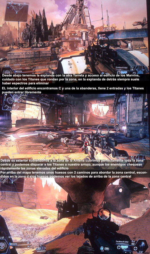 A la derecha del mapa tenemos el edificio con la torre, desde su exterior tenemos posiciones elevadas que cubren la zona azul y todas sus posiciones elevadas, dentro tenemos C en Dominio y otra bandera en Captura. Cuidado que en este edificio pueden entrar los Titanes libremente, por abajo hay en una explanada de tierra donde tenemos una torreta que siempre nos viene bien contra los Titanes. Por las 2 zonas de tierra abajo y arriba llegamos hasta la zona azul y podemos cubrir los edificios centrales.