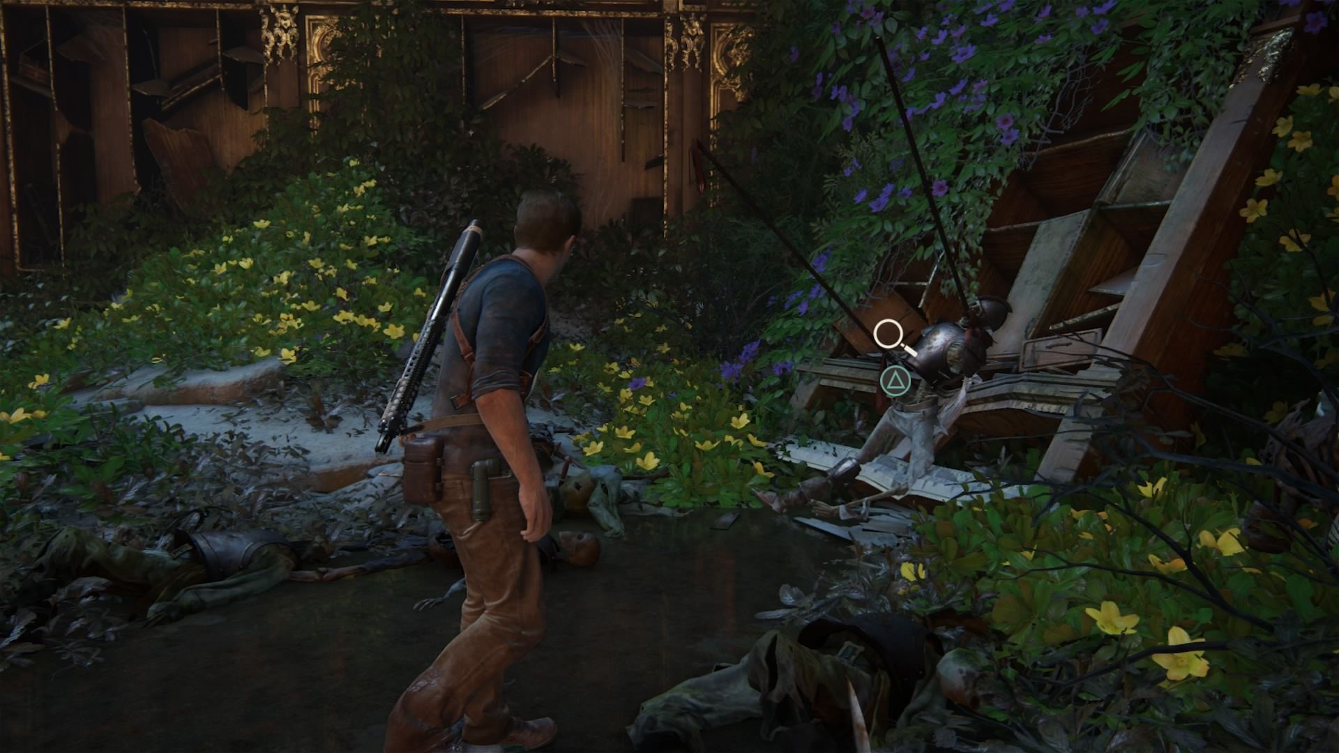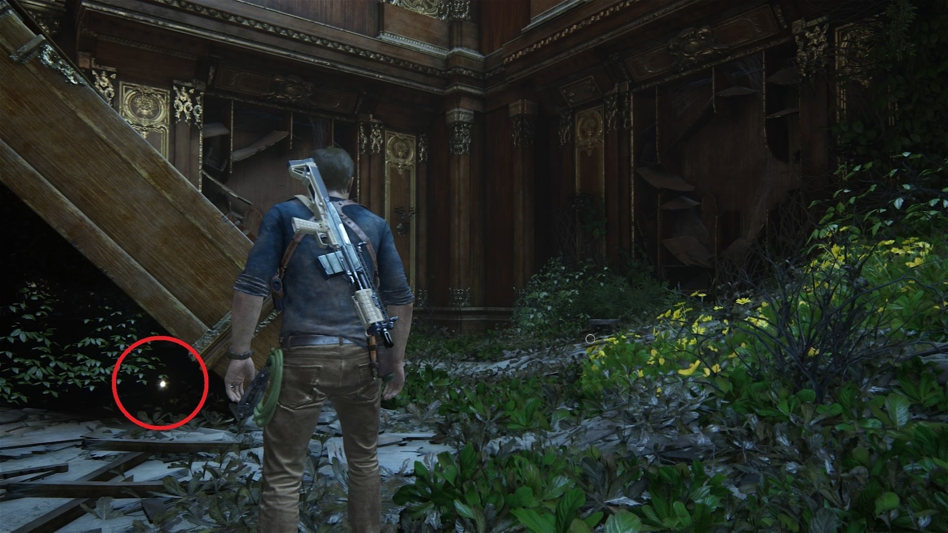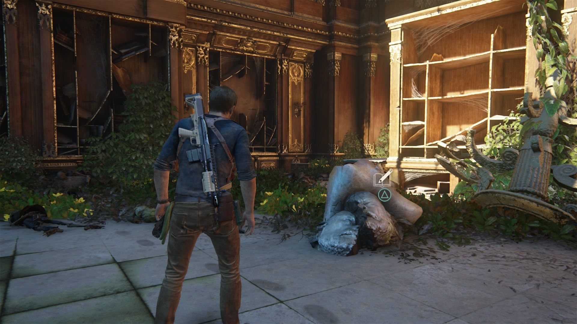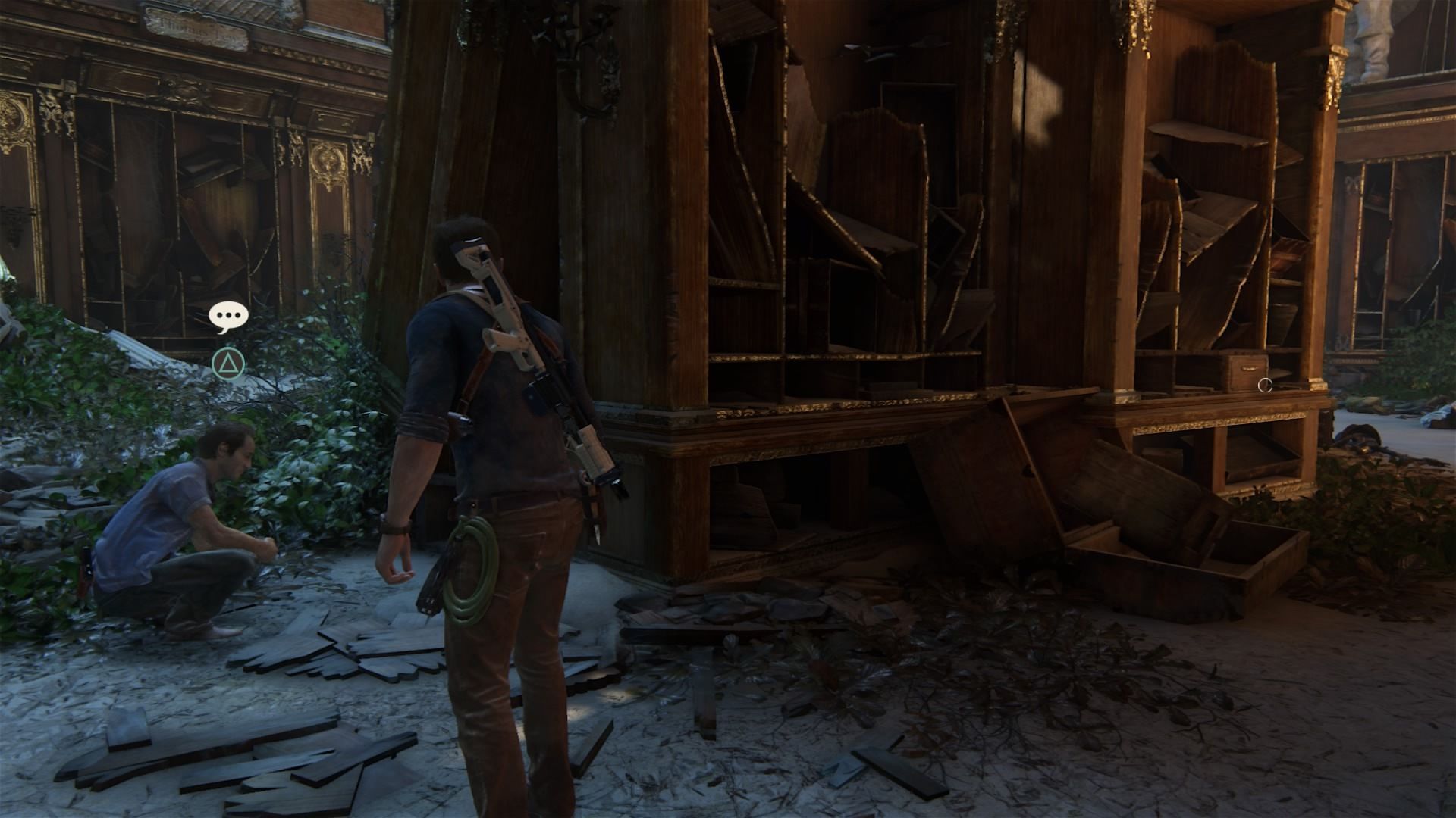 Sube las escaleras, sal por el lado derruido y fija la vista en la anilla de una escultura. Trepa un poco para que llegue tu cuerda y úsala para ascender más arriba, hasta un balcón superior. Dale un empujoncito a Sam para llegar al ático y sube con el cofre que te lanzará. Ve hasta arriba de todo por la escalerilla.