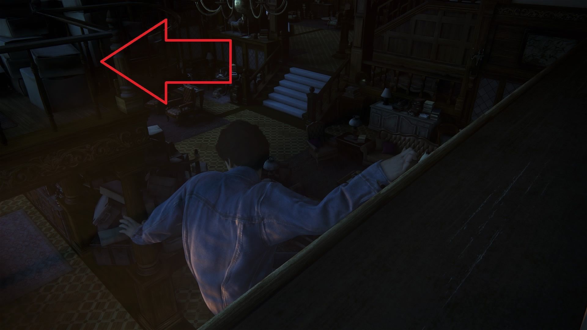 Hecho esto, regresa al salón y empuja la estantería que hay cerca de la chimenea. Agita la foto hasta que se vea a pleno color y guárdatela. Trepa hasta la cornisa encima de la cortina y dirige el salto hacia atrás, donde hay una barandilla. Aquí cogerás el tesoro: bola de nieve pirata.