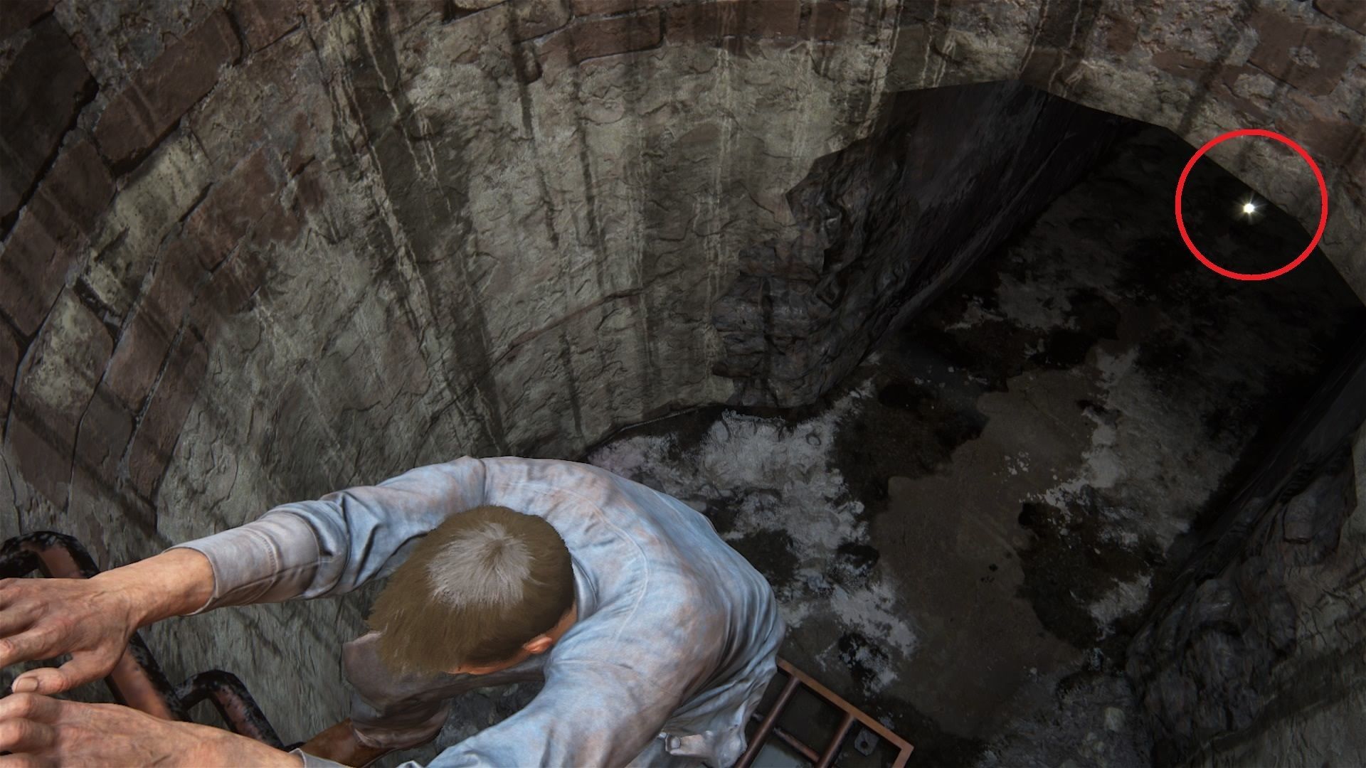 Deslízate por la pendiente, engánchate al poste y cógete a los ladrillos. Desplázate a la derecha y sube. Sigue trepando la torrecilla por los salientes del exterior y, arriba, salta desde el extremo del madero al muro de delante. Ve trepando hasta meterte en el interior por una ventana abierta.