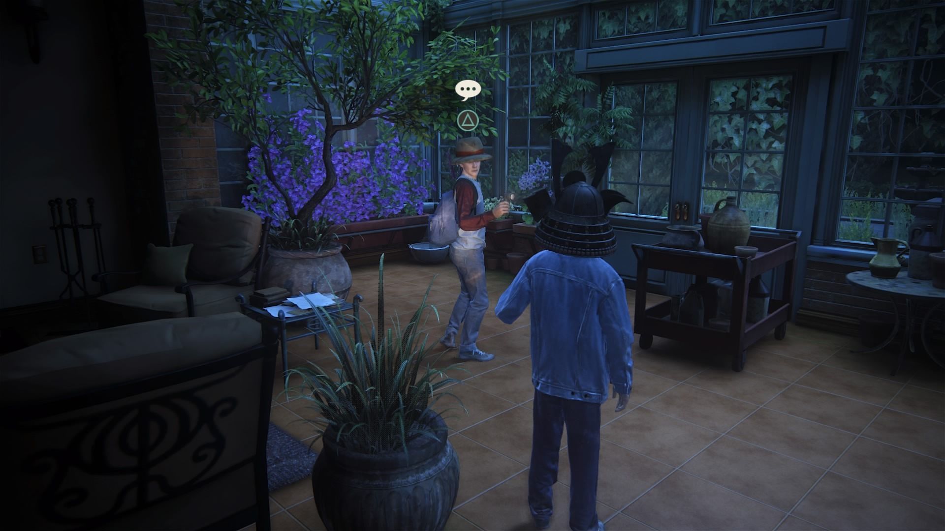 Conversación opcional #23: en la salita a la que se llega por el pasillo junto a las escaleras, tras inspeccionar el papel que hay en la mesita junto a las ventanas, en la zona llena de plantas.