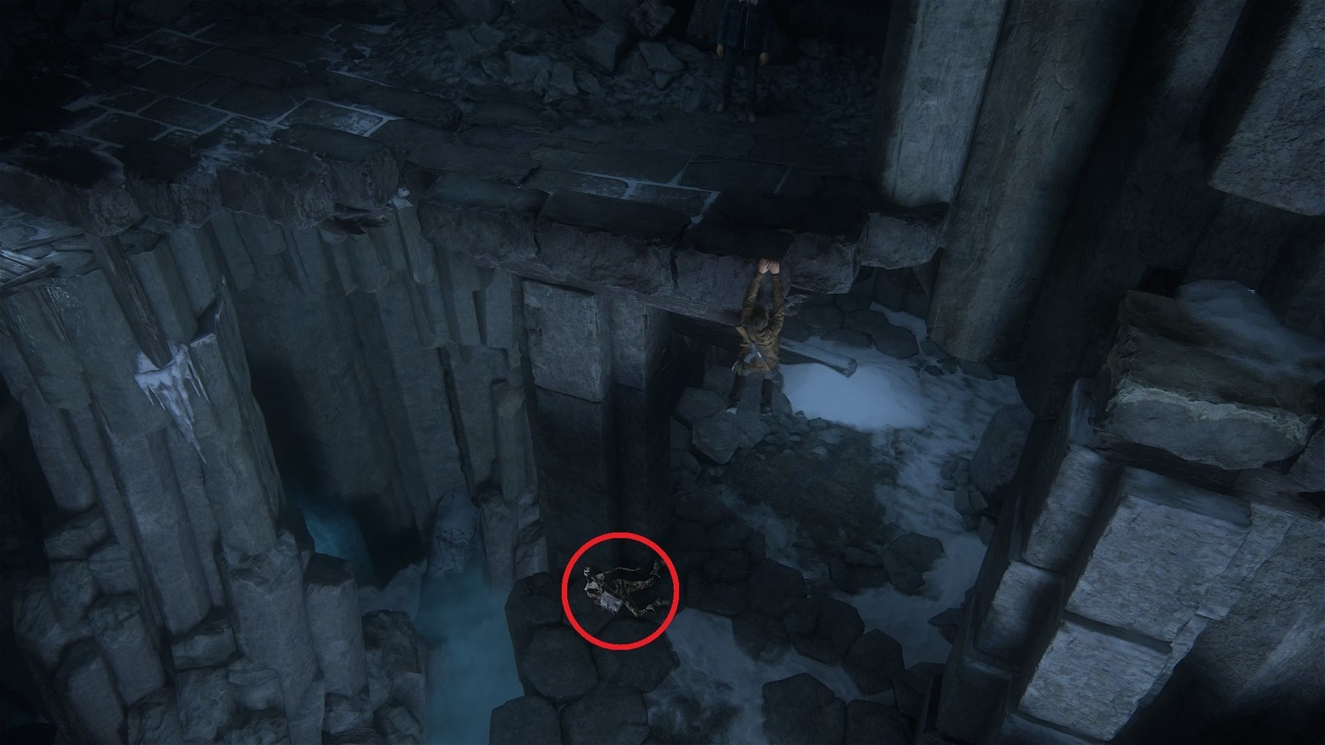 Nota de diario #8: después del enfrentamiento en las montañas, cruza el sendero del bosque y busca el cadáver al pie de un muro escalable.