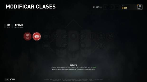 La Campaña Cooperativa ofrece un total de 6 clases diferentes y, aunque podremos ir renovando parte del arsenal durante el avance de cada misión, algunas armas y complementos serán fijos. Es por lo tanto fundamental que, no solo veas el armamento equipado, sino también la progresión de la clase, ya que a medida que la uses irá subiendo de nivel y se desbloquearán nuevas habilidades.