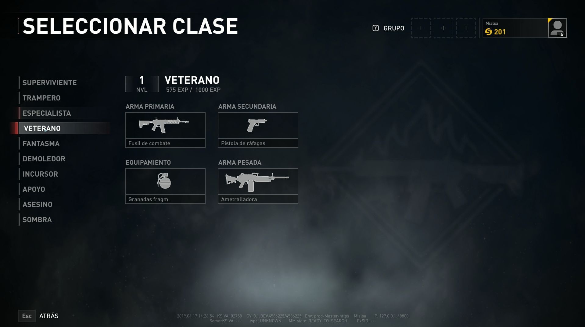 (CLASE: Arma principal, Arma secundaria, Equipamiento y Arma pesada)