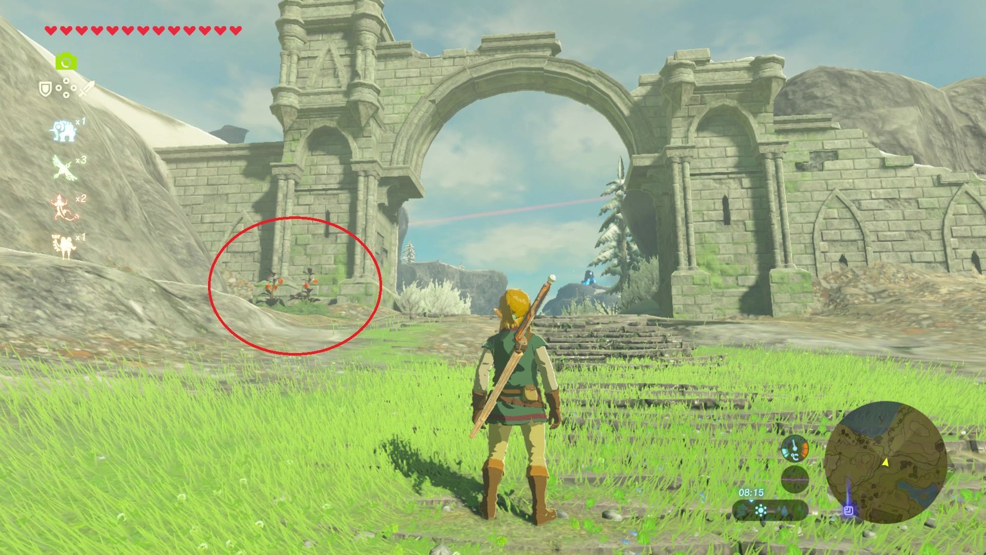 Al oeste del Templo del Tiempo, muy cerca de donde comenzamos la aventura, hay un arco de piedra con bayas ígneas a su lado. Os mostramos el lugar exacto en el mapa.