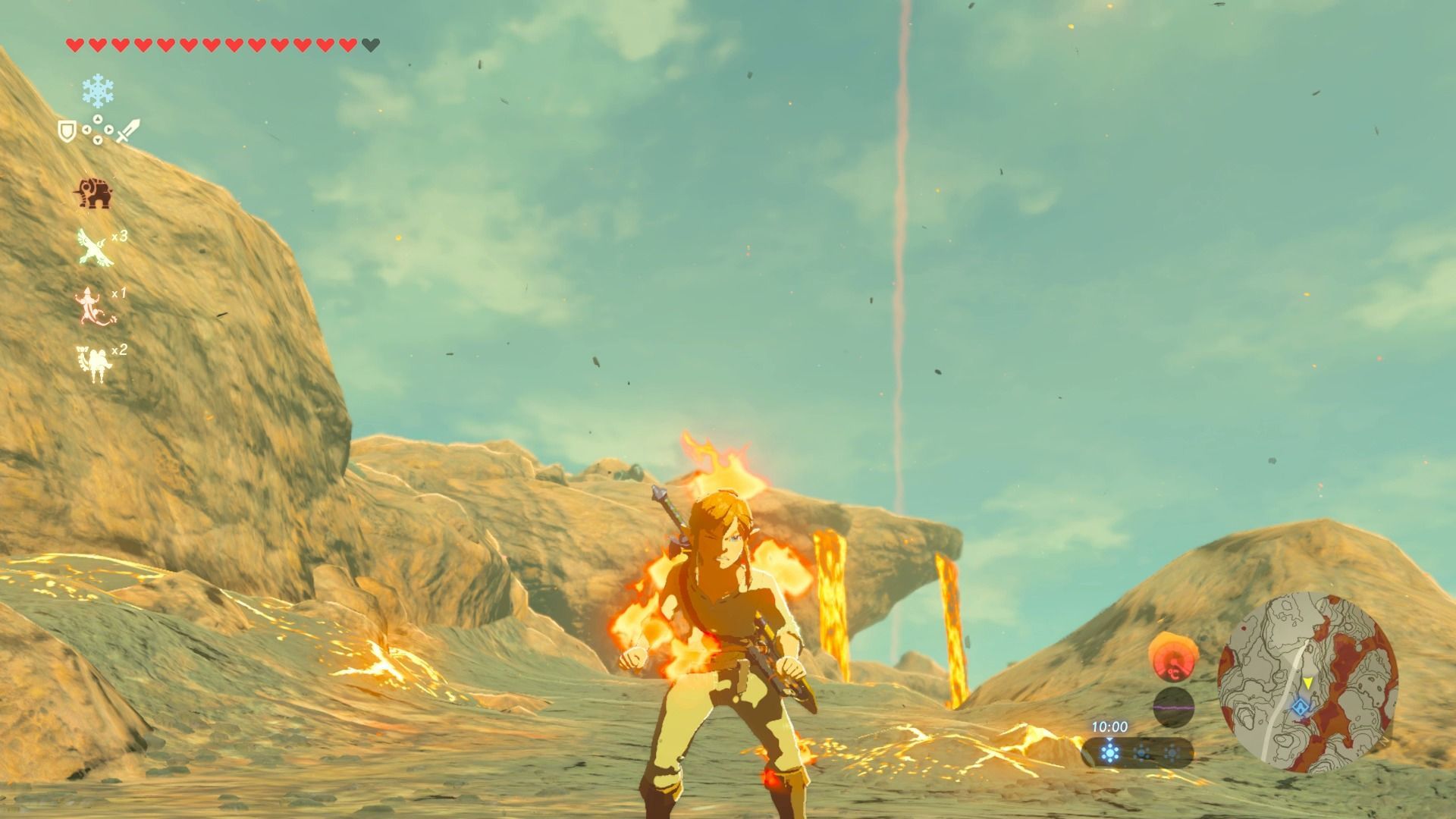 Si entramos en esta zona sin protección, Link comenzará a arder, y su vida bajará con mucha rapidez. Además, en esta zona del mapa no podremos usar las armas, arcos o escudos de madera, ya que comienzan a arder, por lo que solo podremos usar armas y escudos de metal.