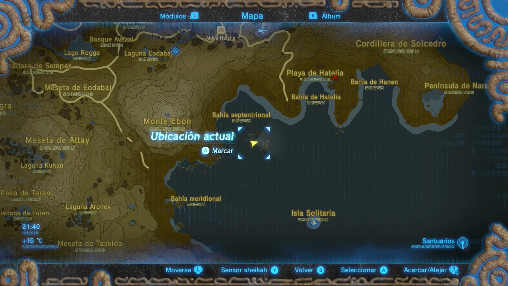 Una vez en la roca habla con Nyel para descubrir que hay un tesoro en el fondo del mar y sitúate encima de la roca que indicamos en la imagen para localizar el tesoro. Usa el módulo imán para sacar el cofre del fondo del mar y ábrelo para conseguir una Rupia dorada. Al hacerlo completarás la misión.
