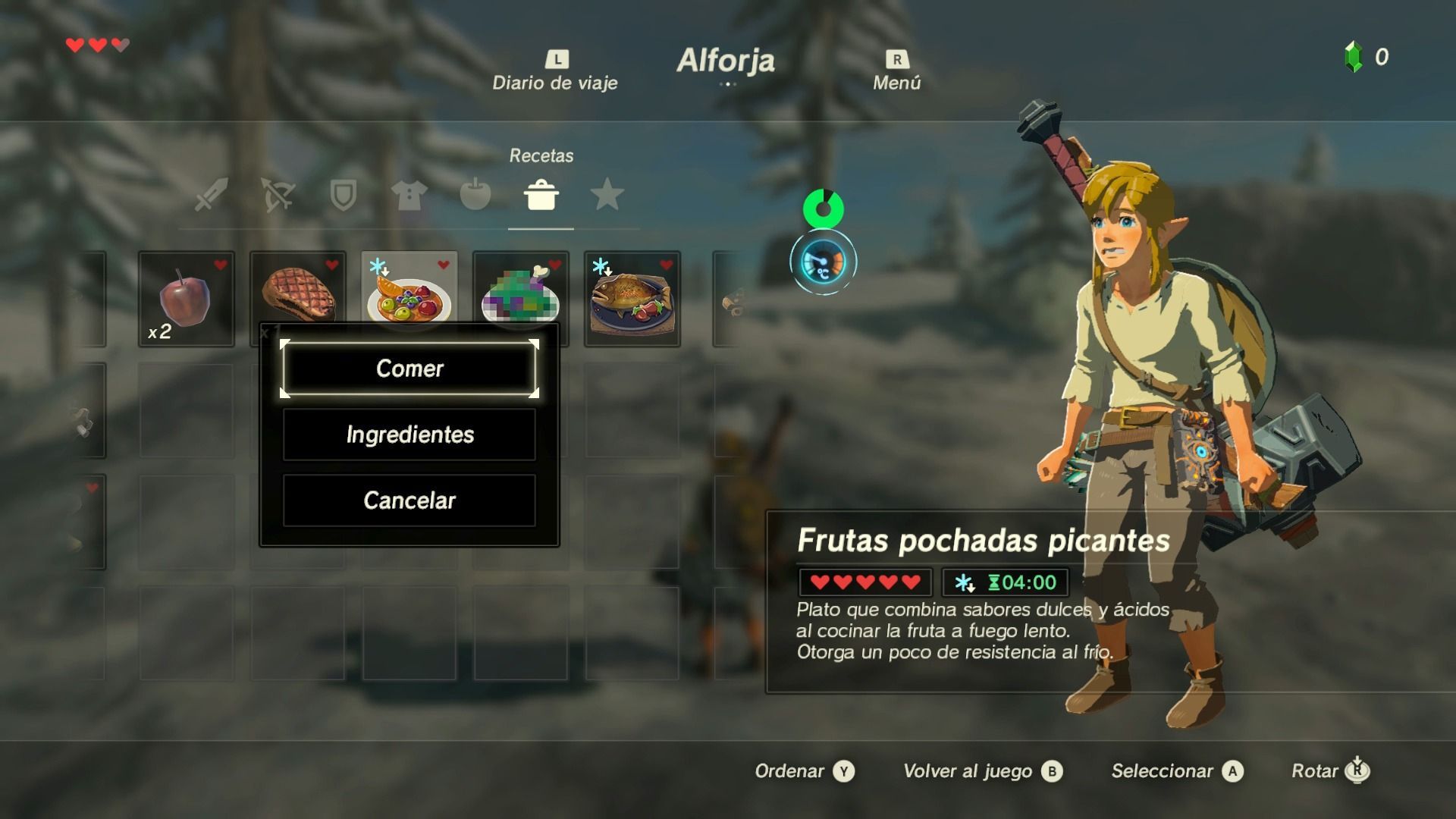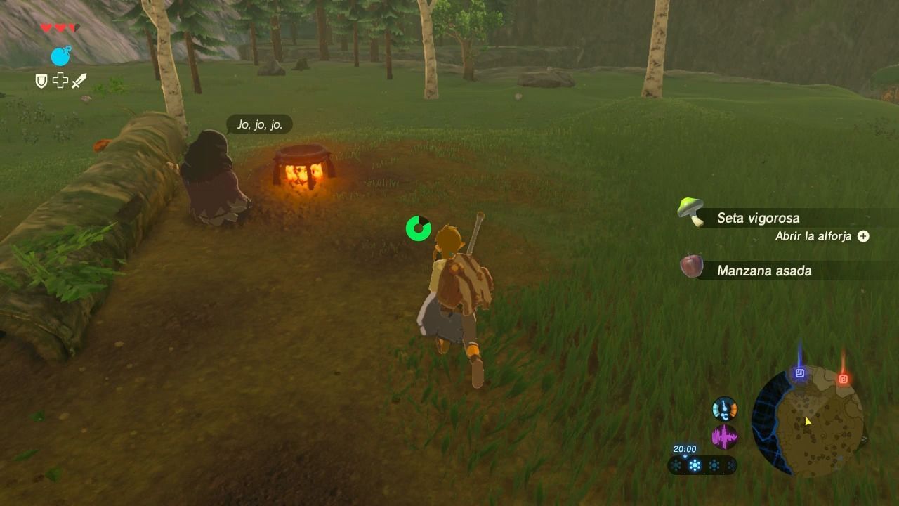 Si preparamos un plato de comida para el anciano nos entregará una casaca forrada que nos servirá para soportar el frío en las primeras horas de la aventura. Para ello necesitamos los siguientes ingredientes: bayas ígneas (dentro de la cabaña podemos encontrar unas pocas), carne de caza (se obtiene si cazamos un jabalí o un zorro con el arco, algo sencillo si les disparamos una flecha en la cabeza), y lubina de Hyrule (disponibles en un estanque que hay en el sureste del Santuario de Maonu, y basta tirarse al agua y coger los peces con las manos).