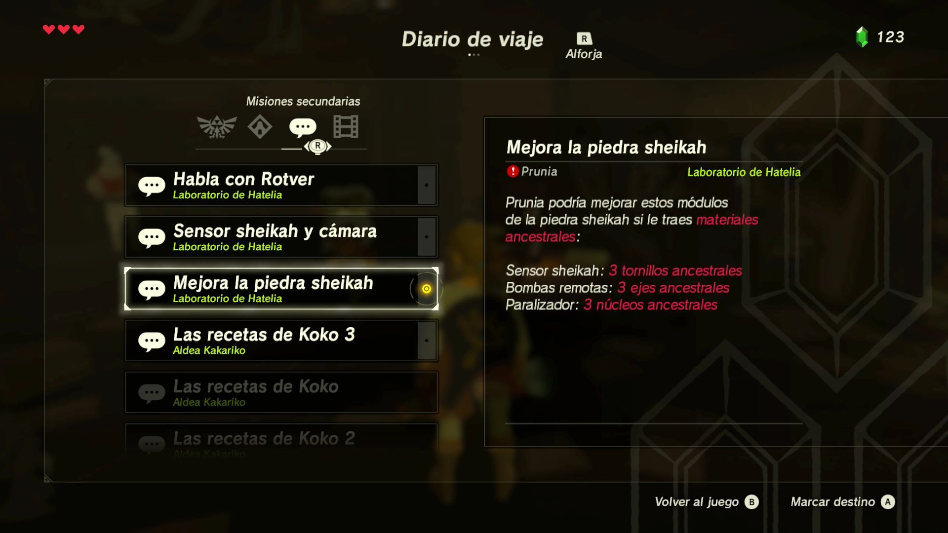 Objetivo: Mejorar los tres componentes de la Piedra sheikah.