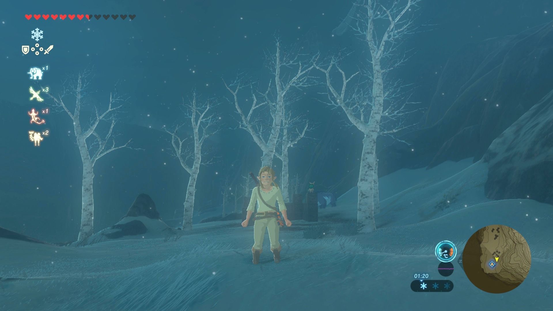 En las zonas más elevadas del mapa, regiones nevadas o en el desierto por la noche, bajan mucho las temperaturas, y si el medidor desciende lo suficiente, Link perderá saludo con el frío.