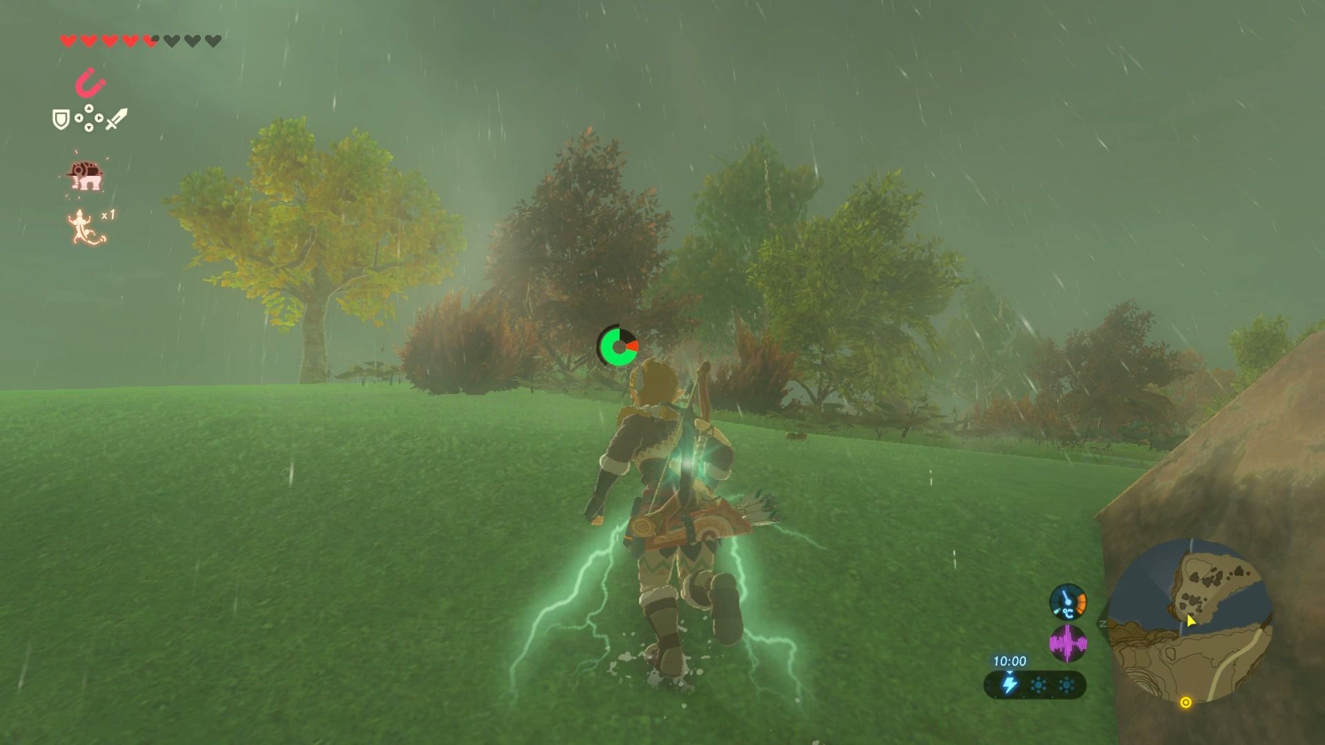 A veces no solo llueve, sino que además hay tormentas eléctricas, algo que viene indicado en la parte inferior de la pantalla, debajo del medidor de temperatura, con el símbolo de un rayo. Cuando te veas inmerso en una tormenta eléctrica desequípate cualquier espada, escudo, arco o armadura que tenga elementos metálicos, ya que un rayo podrá caer sobre Link, y hacerle muchísimo daño.