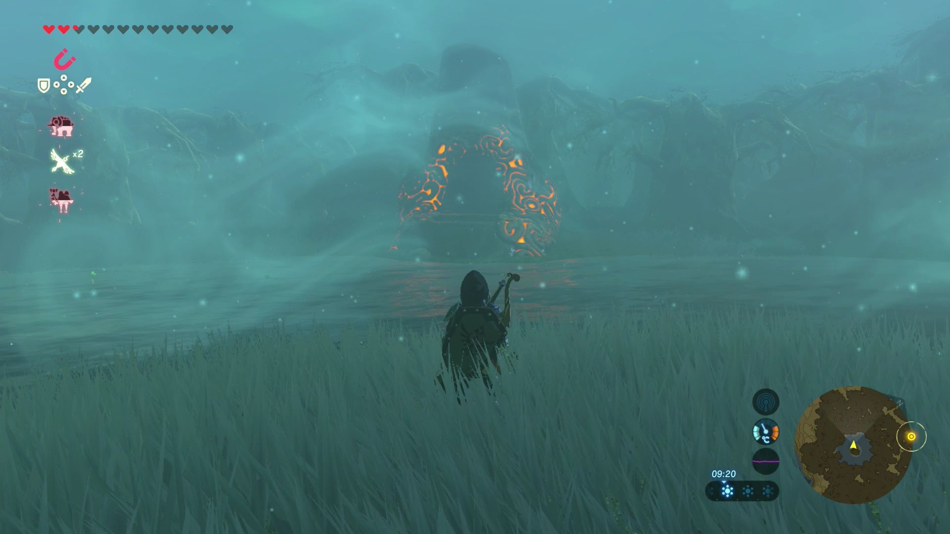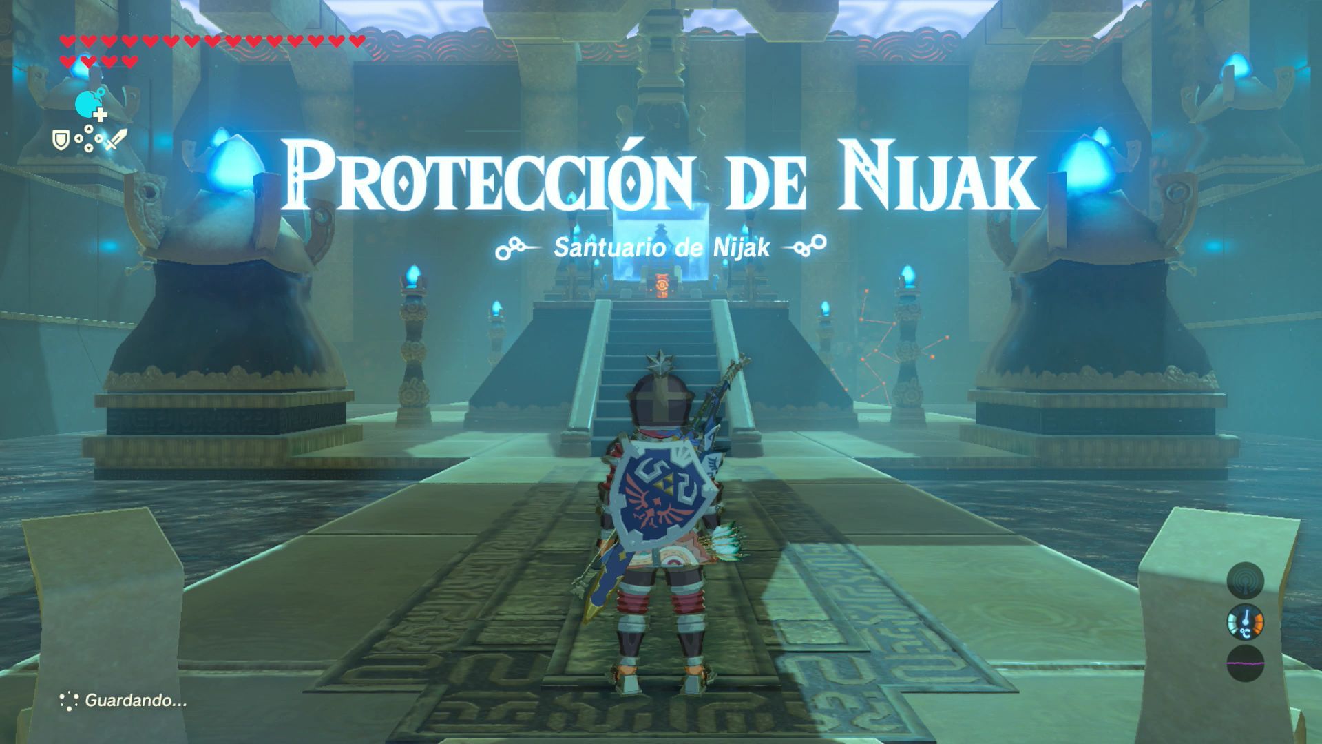 Nada más comenzar verás un camino central que te lleva hasta el cofre y más al fondo está el altar que debes examinar para completar el santuario.