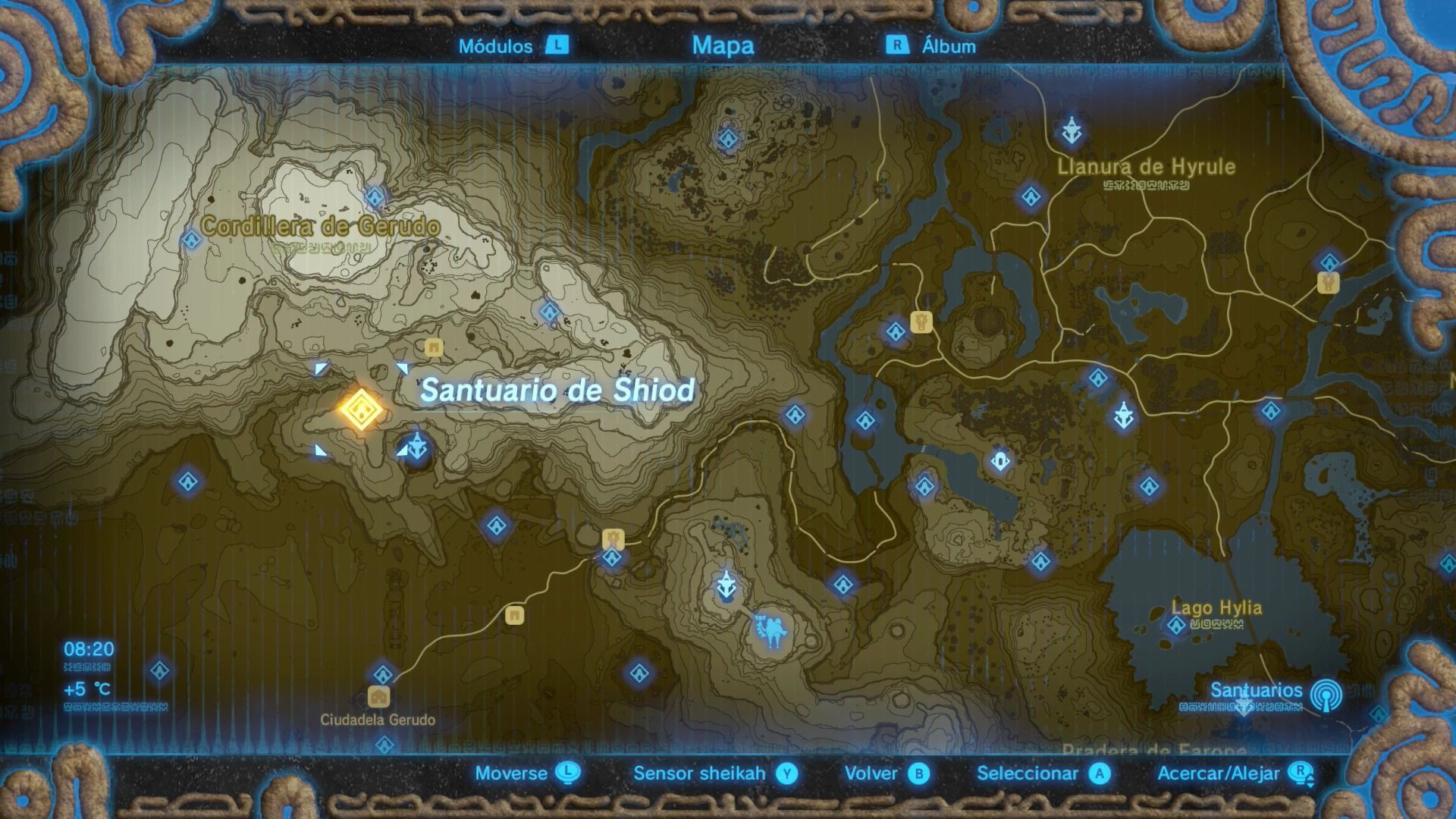 Este santuario se encuentra al noroeste de la Torre de Gerudo. En la zona que indicamos encontrarás una plataforma rodeada por varias rocas, destruye una de ellas para conseguir una Gema luminosay colócala en el centro de la plataforma para hacer que aparezca el Santuario de Shiod.