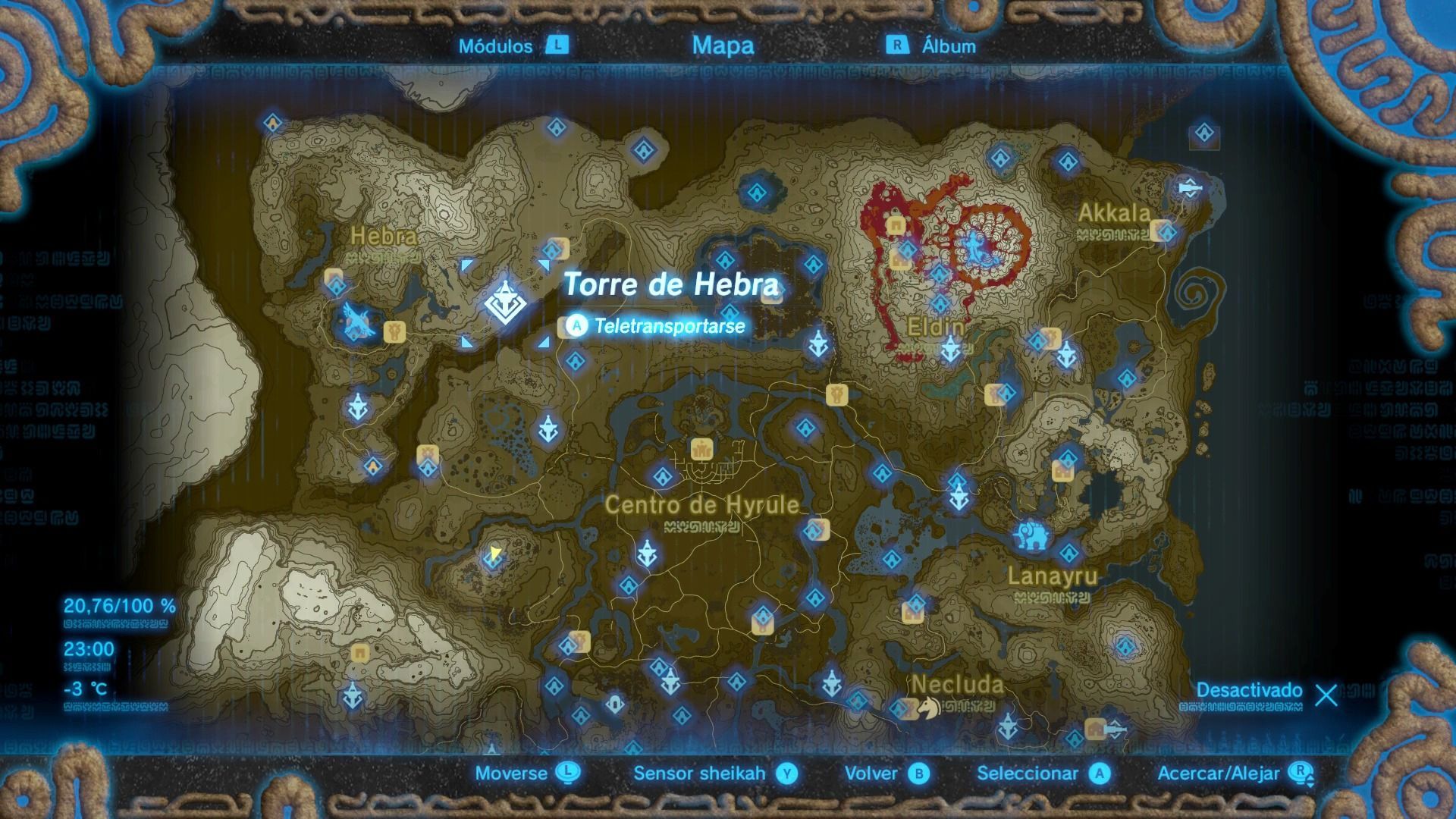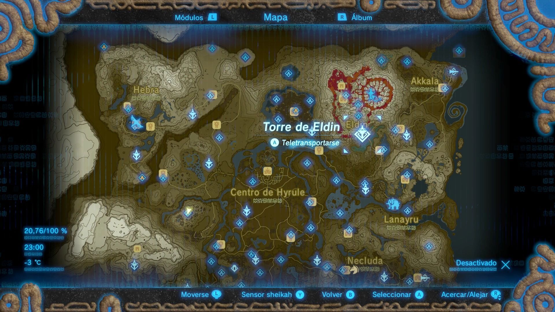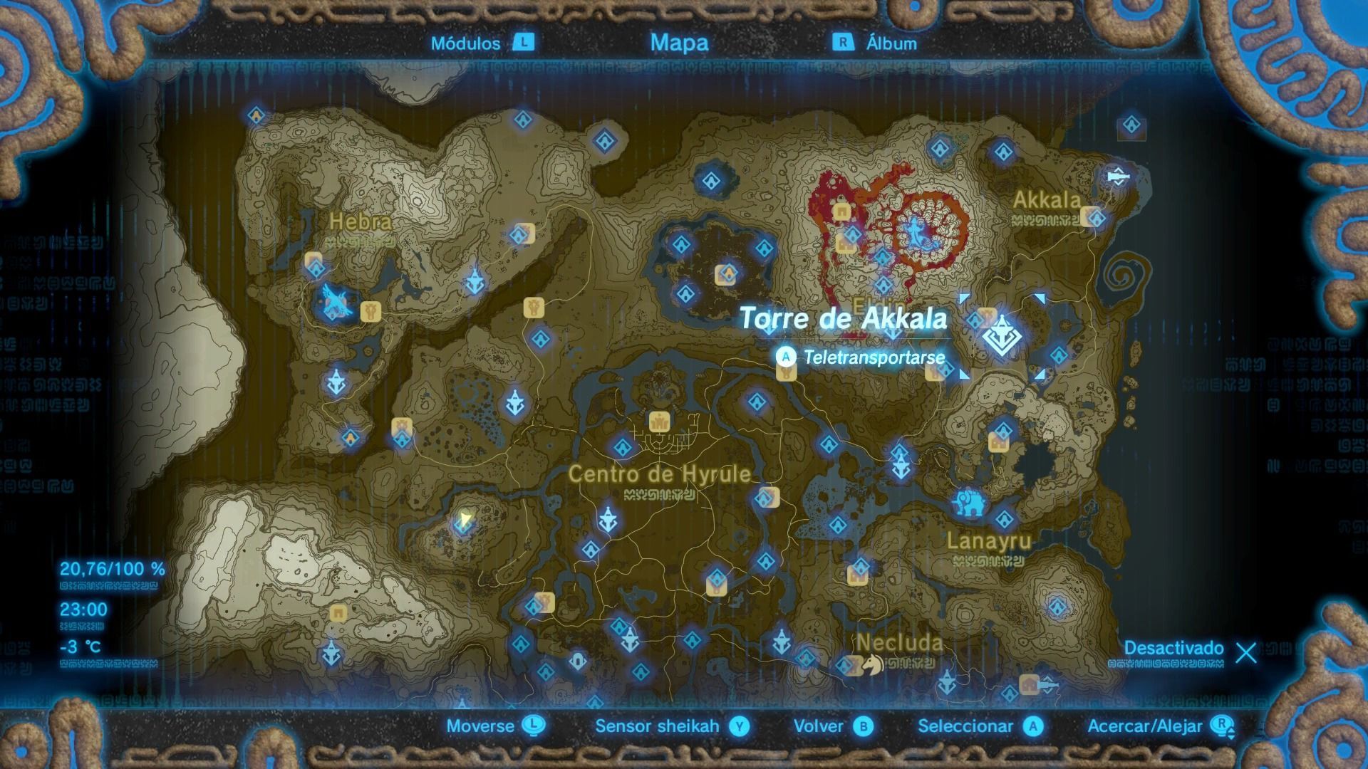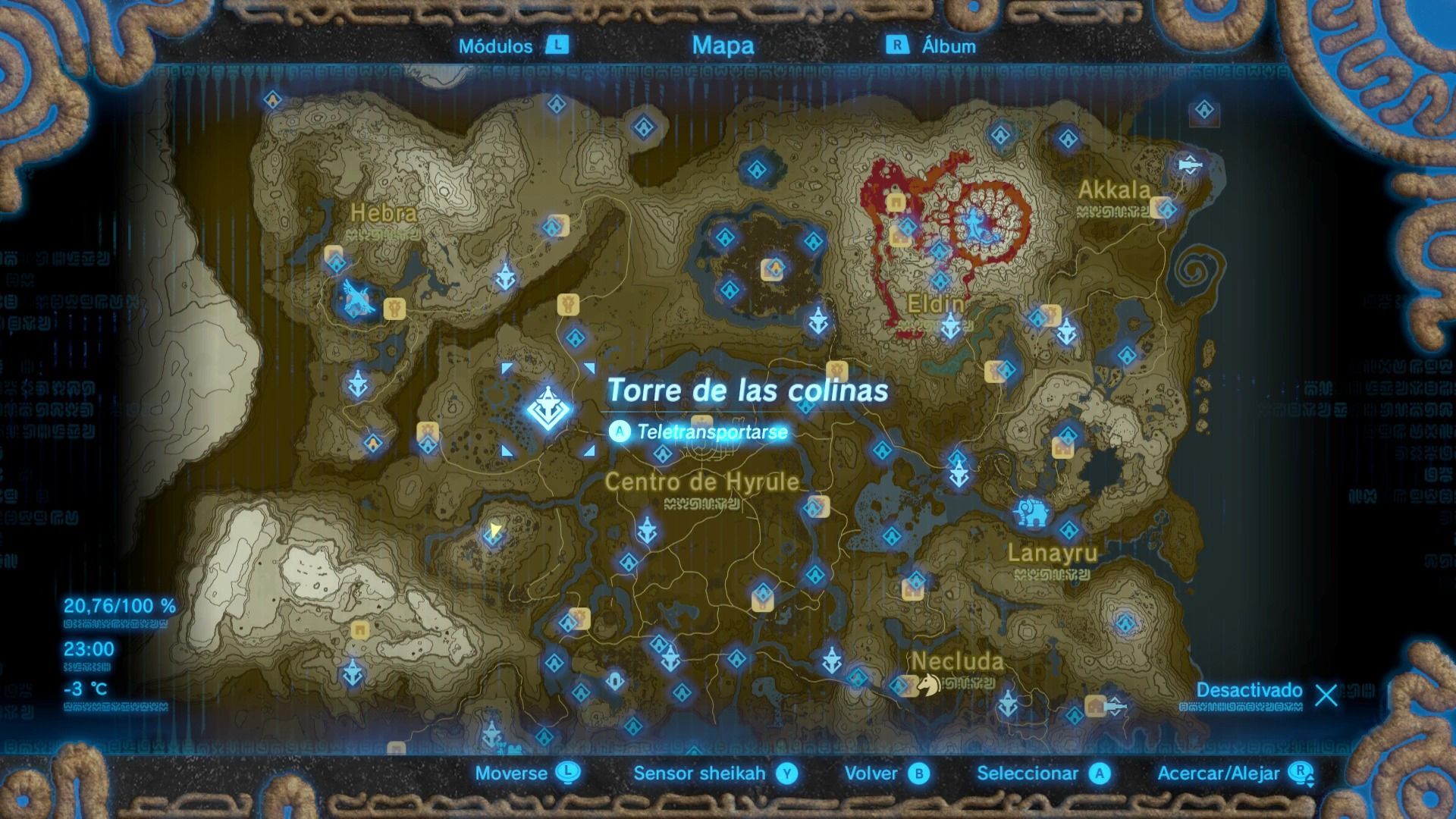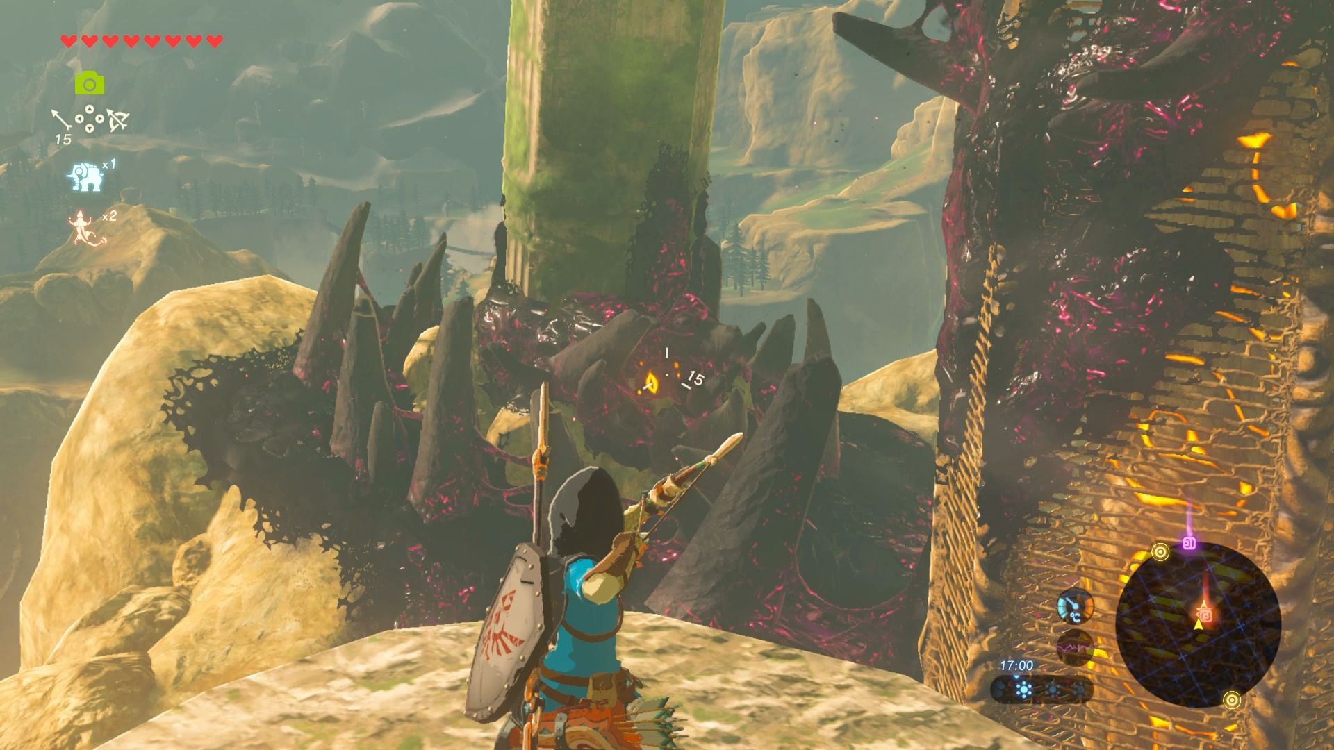 Esta es una de las torres más difíciles de escalar, ya que se encuentra en lo alto del Bastión de Akkala, una fortaleza vigilada por guardianes voladores. Puedes escalar el bastión de diferentes formas, pero siempre intenta ocultarte de la vista de los guardianes. Cuando llegues a la base, verás que la zona está infectada de esa sustancia pringosa que nos daña, por lo que tendremos que buscar un ojo brillante para dispararle una flecha.