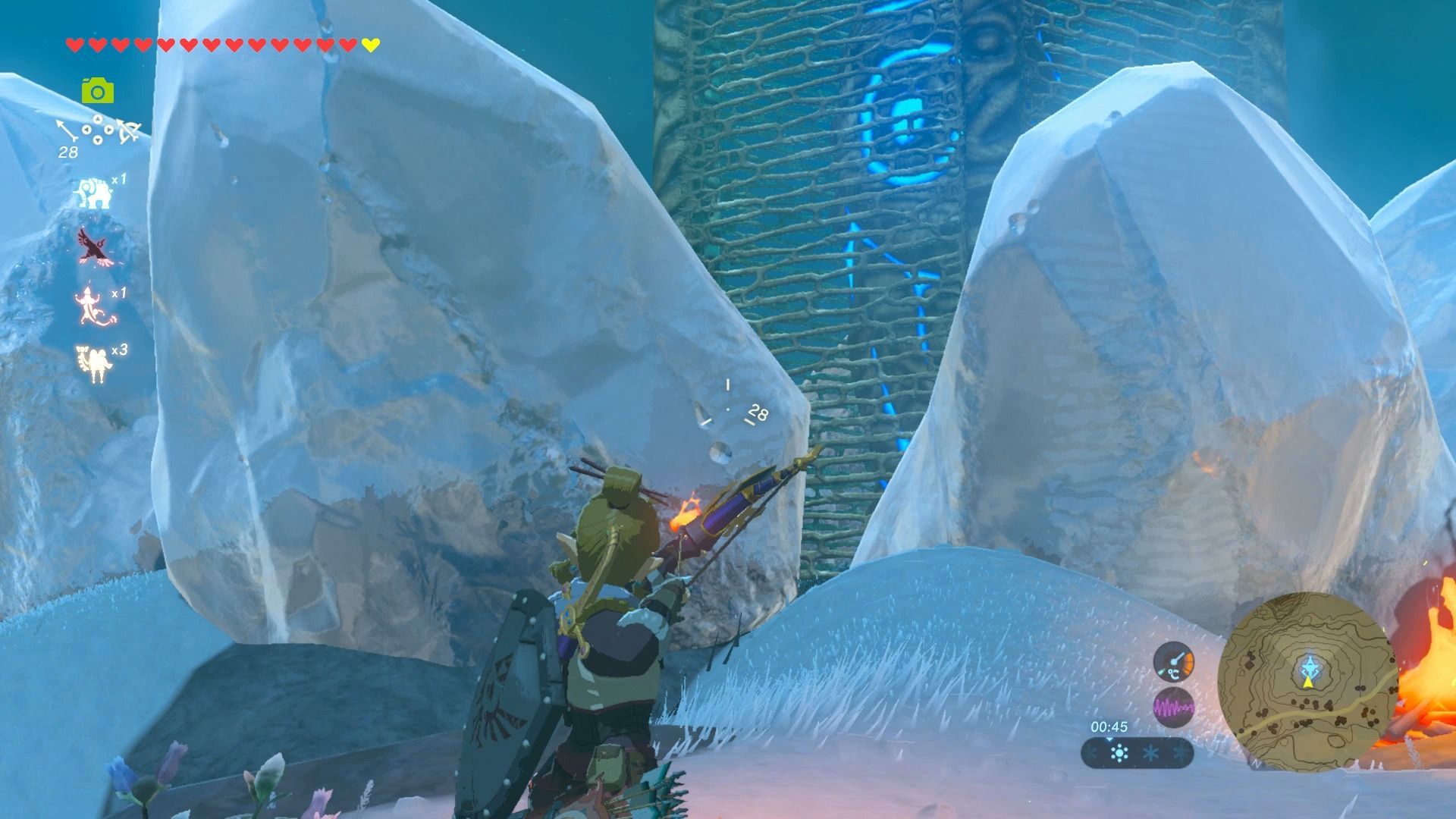 La base de esta torre está rodeada de hielo, que tendrás que derretir con una flecha de fuego, o haciendo una hoguera, con un montón de leña y un pedernal.