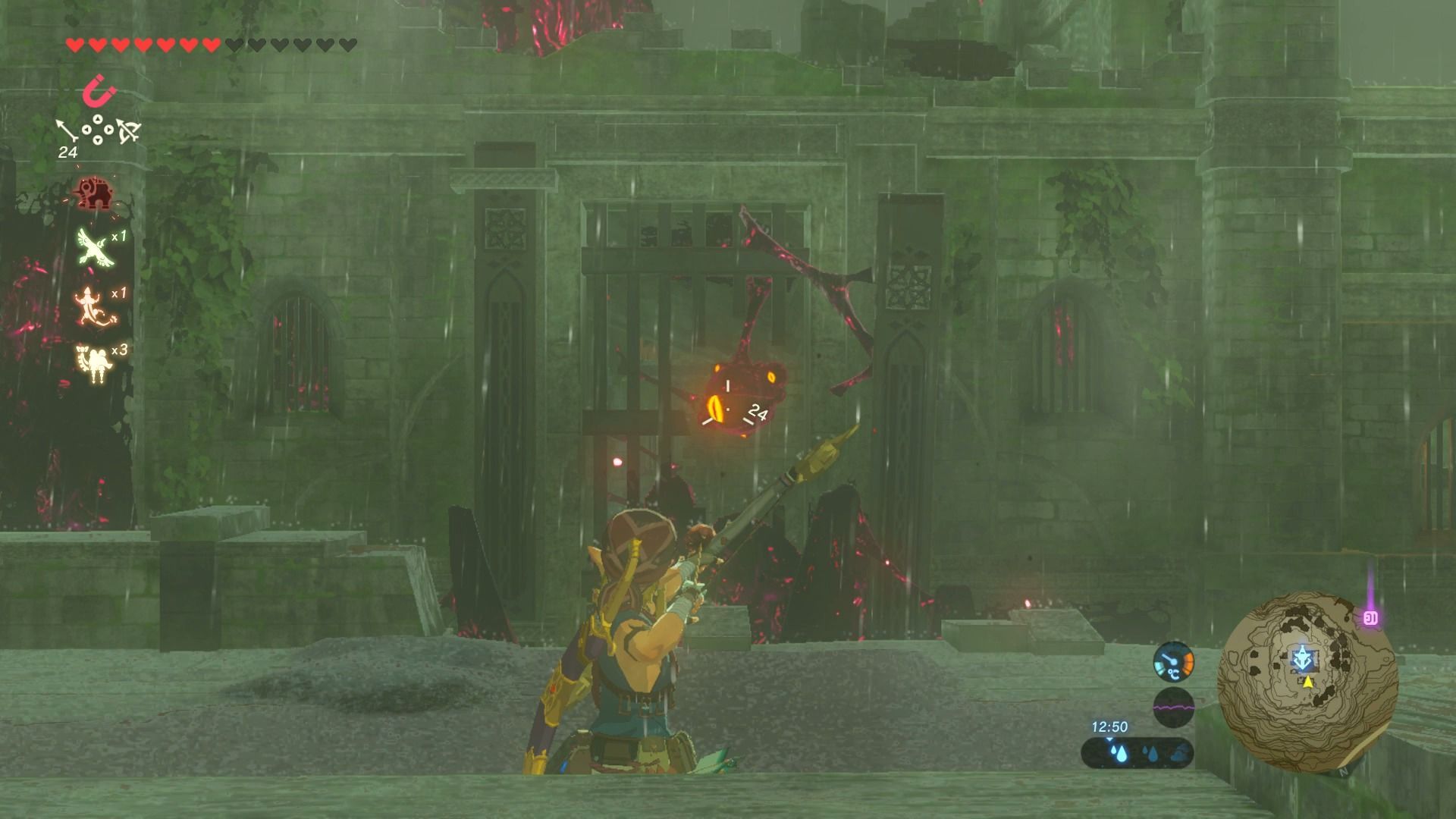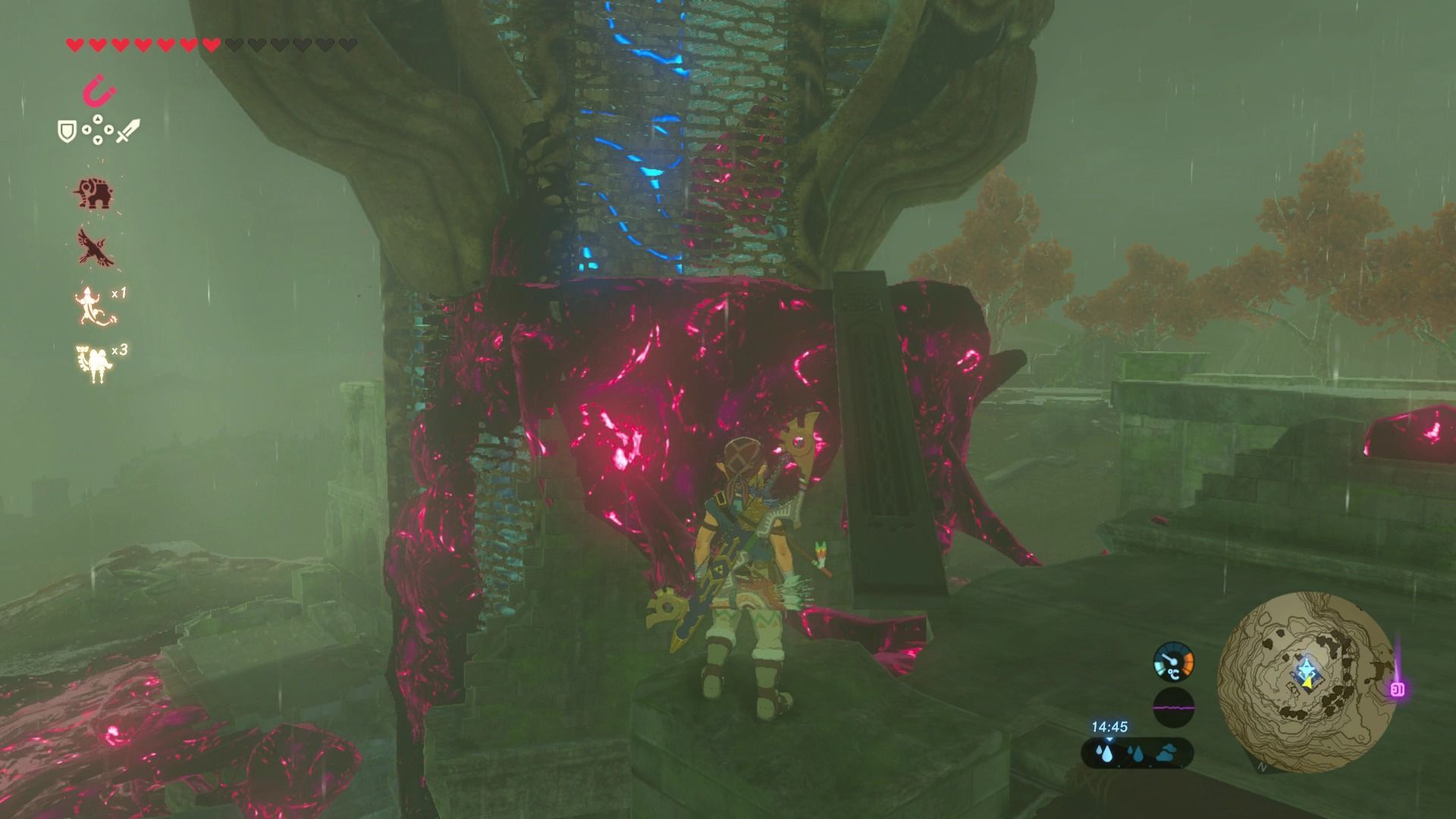 Esta torre está rodeada de esa sustancia maligna que no podemos tocar, por lo que toca ingeniárselas para subir hasta arriba. Es sencillo, y deberemos escalar un pilar que hay el suroeste de la torre y buscar el ojo brillante y dispararle una flecha. Así que caerán los pilares de piedra y podremos subir