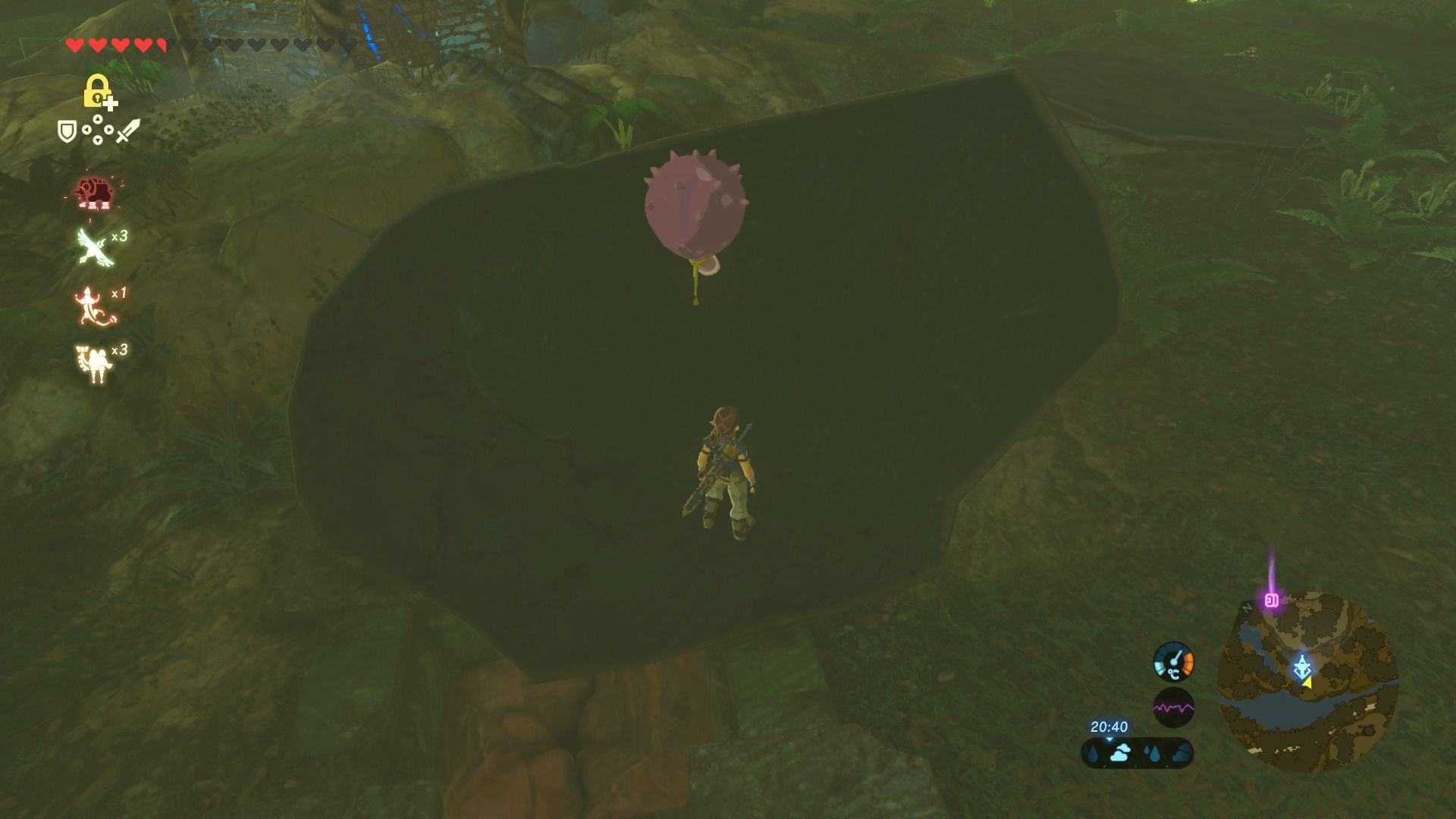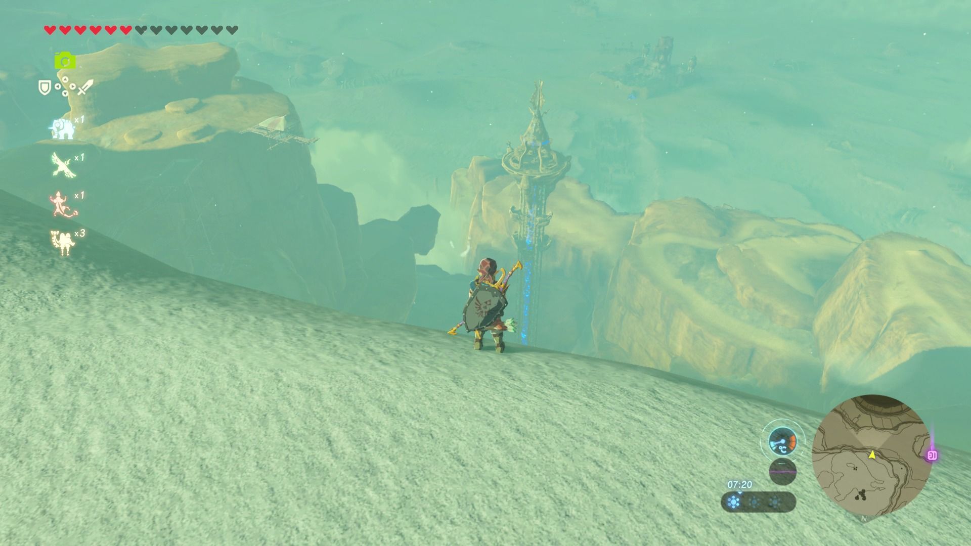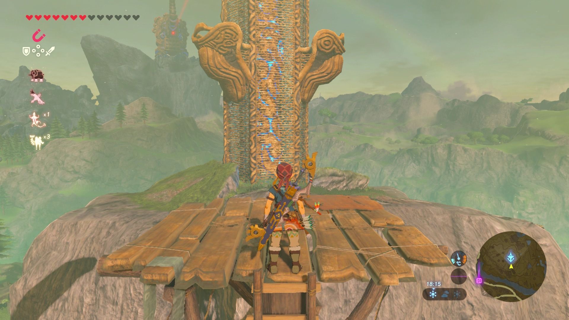 Los primeros escalones de esta torre están muy elevados, por lo que a no ser que tengas una gran barra de resistencia no podrás alcanzarlos. Al sur de la torre y al norte hay dos placas metálicas que están tapando sendas corrientes de aire. Para quitarlas podemos usar el paralizador, dar unos cuantos golpes a las placas, y que salgan disparadas, o usar globos de octorok, que podemos recoger en las cercanías dentro de un agujero, y que si cogemos en el inventario, y después dejamos caer sobre las placas, las levantarán en el aire y dejarán el agujero y la corriente del aire al descubierto, que podremos aprovechar para ascender con la paravela.