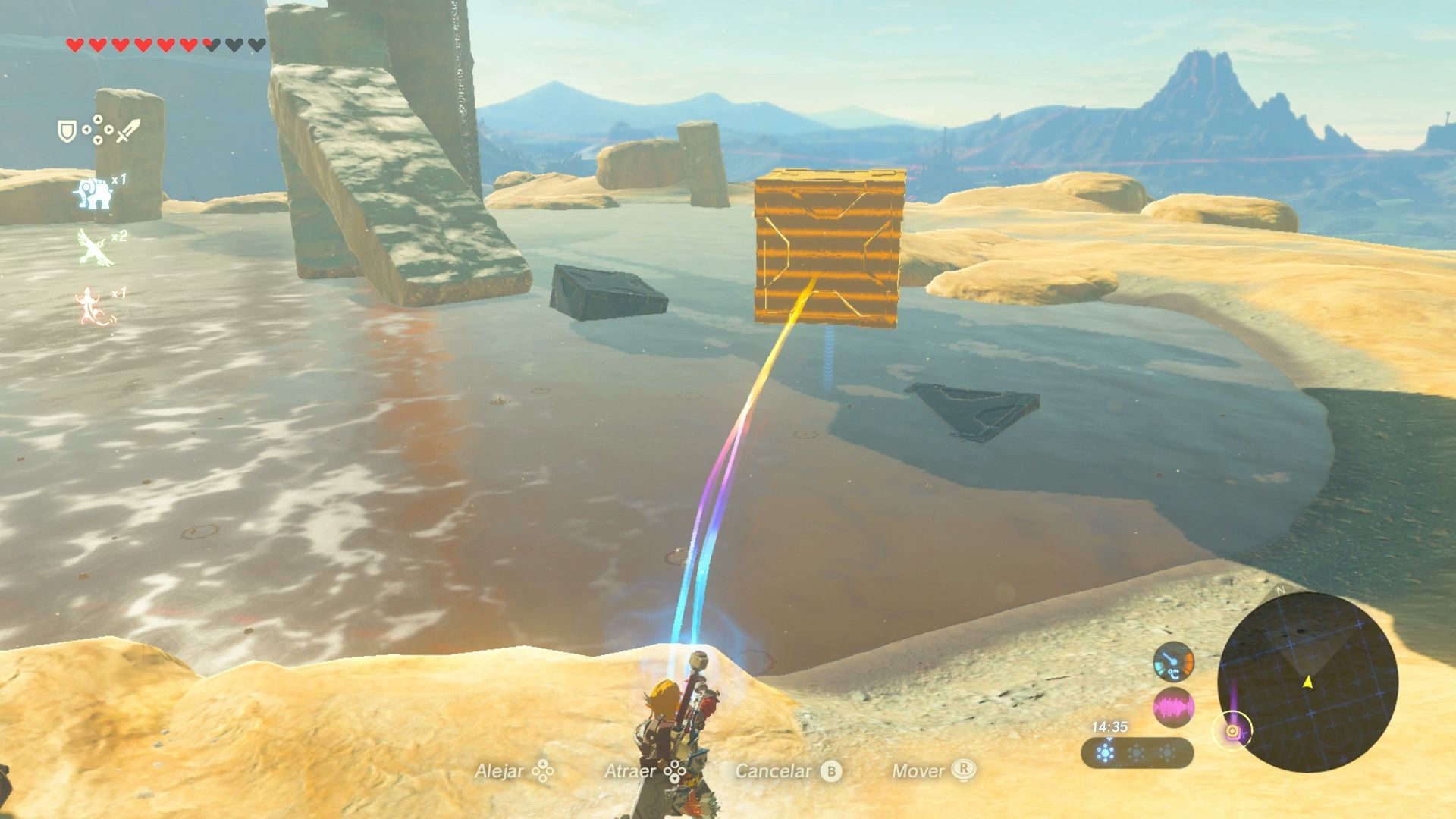 Esta torre está rodeada de una ciénaga, y además azota muy fuerte el viento, por lo que intentar llegar desde una zona elevada con la paravela está descartado. por lo que tendrás que utilizar el imán y mover las cajas metálicas para realizar un camino sobre el fango y así poder alcanzar la torre. Crear bloques de hielo también es una buena opción.